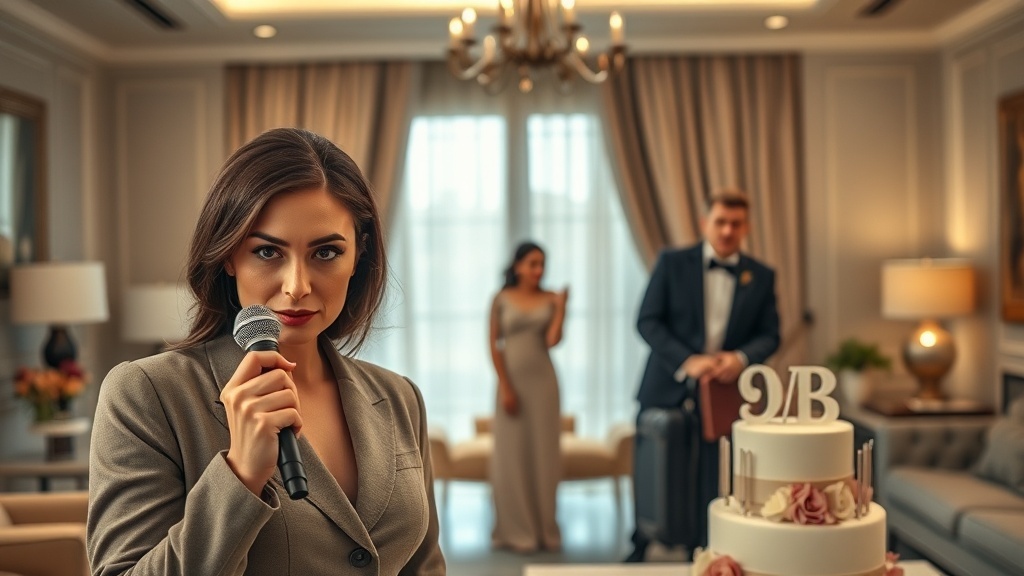 Когда пришло время разрезать торт, огромный, трёхъярусный, увенчанный нашими фигурками, ведущий объявил, что у матери жениха есть для нас особенный сюрприз. Музыка стихла. Валентина Петровна взяла микрофон, и её лицо озарила торжествующая, почти хищная улыбка.