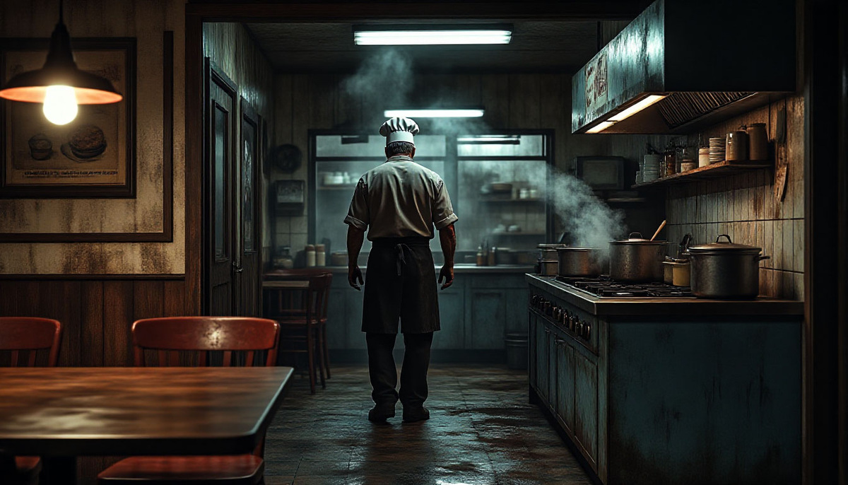 Во-первых, повар. Он никогда не поворачивался лицом. Всегда спиной, всегда в своём колпаке. Сколько бы я ни заходил, он был там, что-то шинковал, мешал. Словно часть кухонного оборудования.