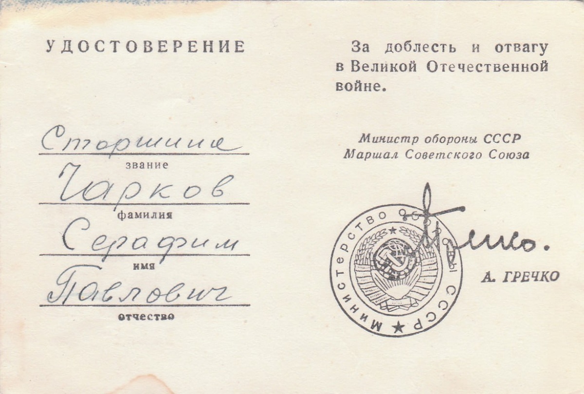 Удостоверение к знаку "25 лет победы в Великой Отечественной войны" на Чаркова Серафима Павловича. В годы войны проходил службу санитарным инструктором в 225 Отдельном Зенитном артиллерийском дивизионе ПВО в Ленинграде. Источник: отсканированное удостоверение из личной коллекции. #удостоверение #Ленинград #ветеран #документ