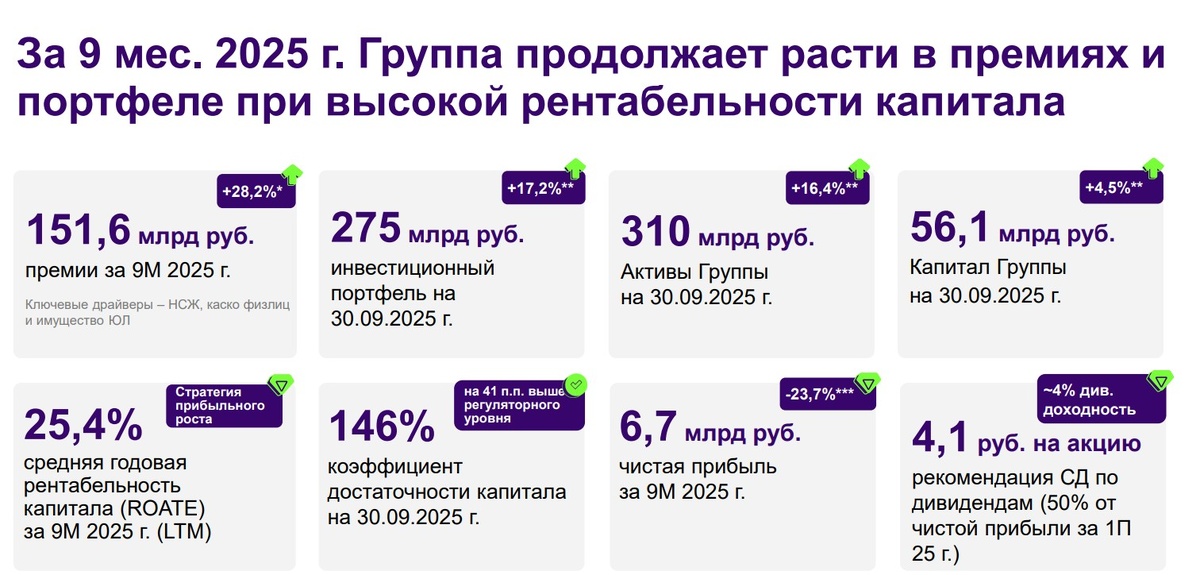 💵 Отчитался Ренессансчик по МСФО за 9 месяцев. 📈 Общий объём брутто-премий вырос на 28,2% г/г до 151,6 млрд руб. 👉 Сегмент life продолжает расти уверенными темпами +50,9% г/г. 👉 А вот сегмент non-life вырос всего на +2,2% г/г. ___________________________________________________________ 📉 Чистая прибыль за 9 мес. 2025 г. — 6,7 млрд руб., снижение на 23,7% г/г. ❗️НО, снижение только из-за того, что компания, да и вообще все страховщики с 1 января 2025 должны отчитываться по новому стандарту учета операций по договорам страхования МСФО 17 «Договоры страхования», который заменил стандарт МСФО 4. В результате чистая прибыль Группы за 9 мес. 2024 г. в соответствии со стандартом МСФО 4 составляла 4,5 млрд руб, а в соответствии с новым стандартом МСФО 17 этот показатель равен 8,8 млрд руб. Поэтому снижение чисто техническое. 📈 А так рост бы составил 48,9% г/г с 4,5 до 6,7 млрд руб. ___________________________________________________________________ 📈 Инвестиционный портфель. Общий объём