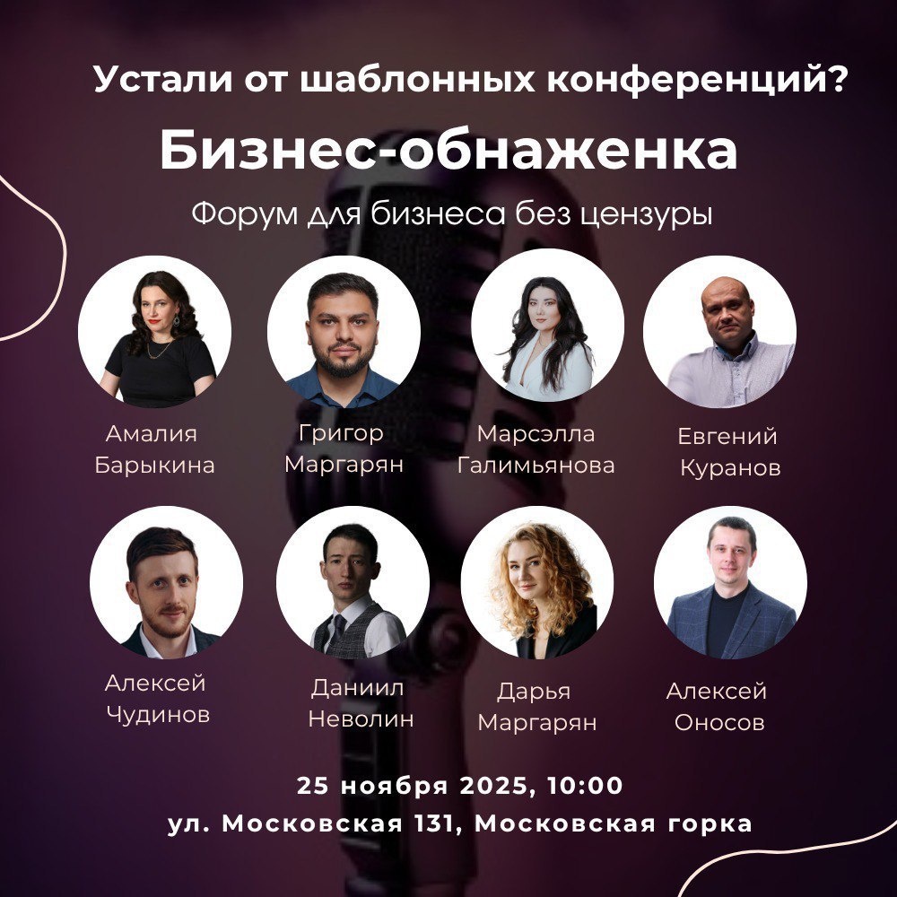 📣 ФОРУМ «БИЗНЕС-ОБНАЖЁНКА 2025» — честный диалог о стратегии бизнеса 🗓 25 ноября, Екатеринбург 📍 Отель «Московская Горка», ул. Московская, 131 ⏰ Начало: 10:00 Регистрация 🔍 Почему «Бизнес-Обнажёнка» Название подчёркивает главный принцип форума — максимальная открытость. Здесь обсуждают реальные кейсы, управленческие решения, ошибки и стратегии, которые работают в условиях турбулентности. 👥 Для кого форум • Для собственников компаний • Для генеральных и операционных директоров • Для предпринимателей, которым нужны инструменты, а не мотивация • Для тех, кто работает с экспортом, инвестициями и развитием рынков 🎙 Спикеры • Алексей Чудинов — экспорт без бюджета • Амания Барыкина — невозвратные инвестиции и глобальная поддержка проектов • Марсэлла Галимьянова — маркетинг и управление командами • Григор Маргарян — цифровизация и операционная эффективность • Даниил Неволин — антикризисные стратегии и рост в нестабильности 🎯 Что получат участники • Честный разбор реальных кейсо