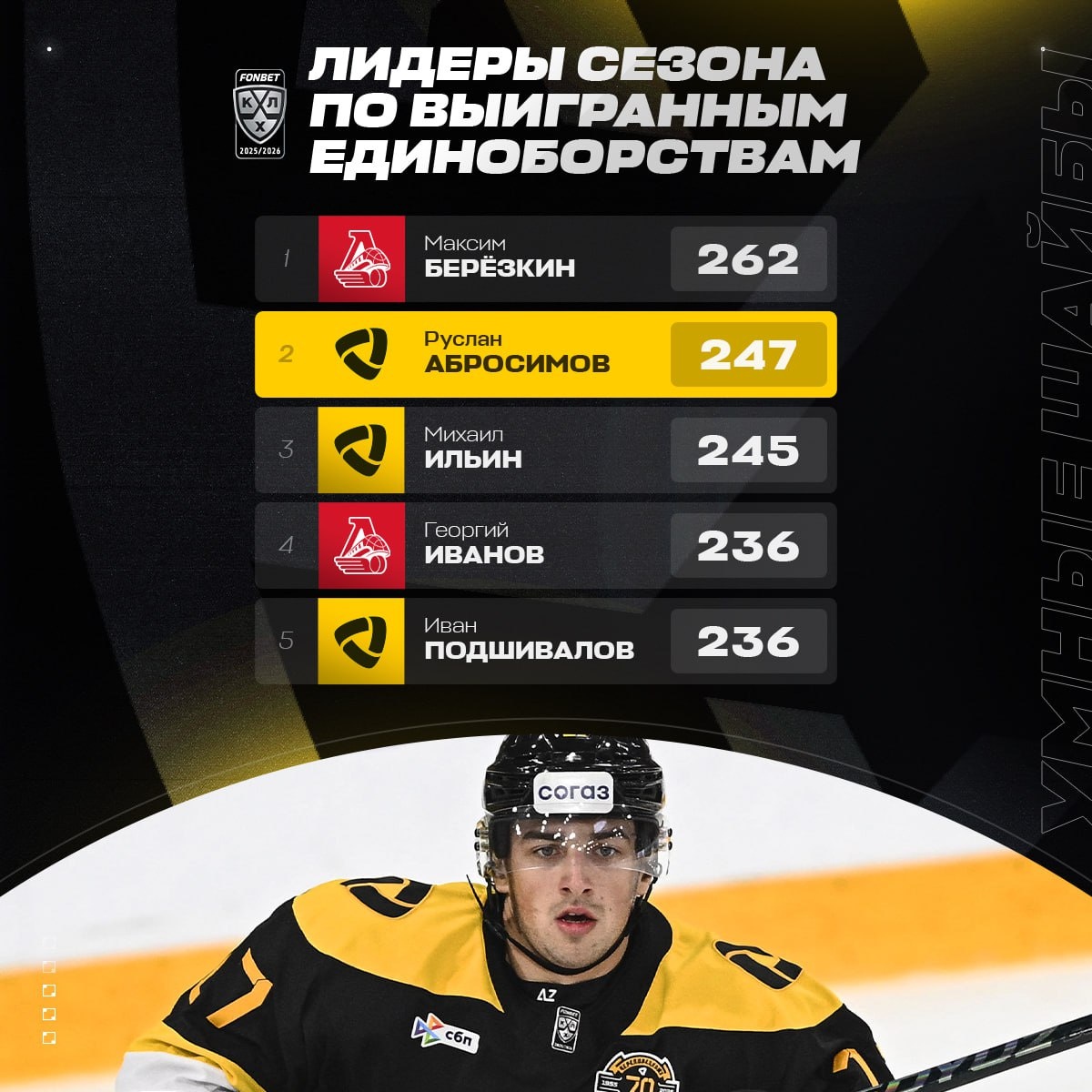 Игроки «Северстали» и «Локомотива» продолжают доминирование по количеству выигранных единоборств. Сегодня у Руслана Абросимова будет возможность приблизиться к лидеру рейтинга. KHL.ru рассказывает о показателях хоккеистов в сезоне 2025/2026 при помощи данных умной статистики. 🟡 x ⚓️ 19:00 мск 🍿