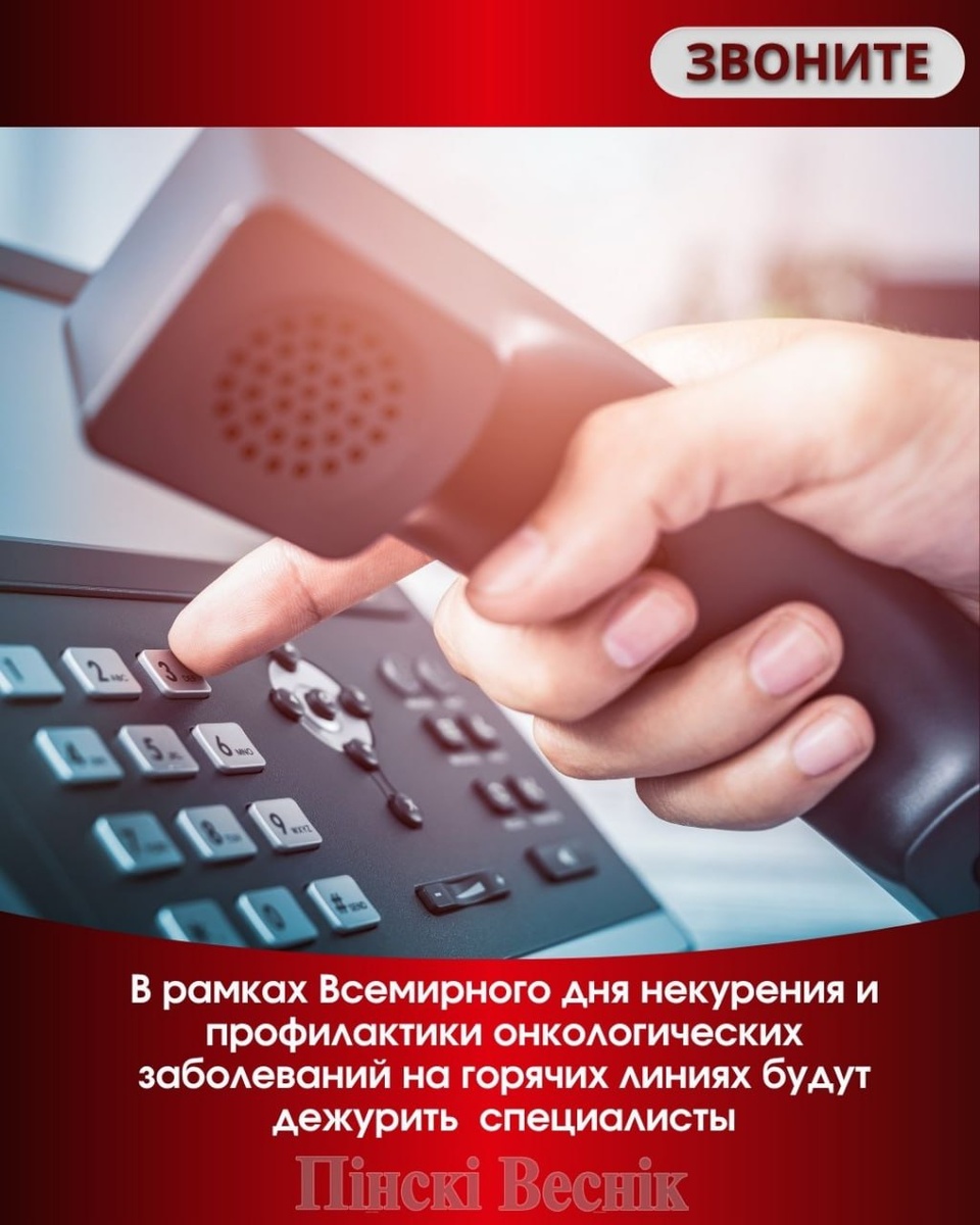 ✏️Всемирный день некурения и профилактики онкологических заболеваний — специалисты на горячих линиях! 21.11.2025 будут доступны врачи и психологи по консультациям: ➡️Бут-Гусаим Татьяна (врач по медпрофилактике) 8:00–12:00 — 65‑36‑77 ➡️Видзяйло Галина (врач‑онколог) 9:00–12:00 — 65‑97‑55 ➡️Полюхович Наталия (врач‑психиатр‑нарколог) 11:00–13:00 — 63‑36‑70 ➡️Карпович Ростислав (психолог) 8:00–11:00 — 63‑36‑85 Ткач Ольга (психолог) 14:00–16:00 — 65‑98‑11 ✔️Звоните, задавайте вопросы и получайте квалифицированную помощь. 📍📍@Пинский Вестник 📱ЮТУБ 📱САЙТ 📱ИНСТ 📱ВК 📱ОК 📱ФЕ 📱TikTok 📱Прислать новость