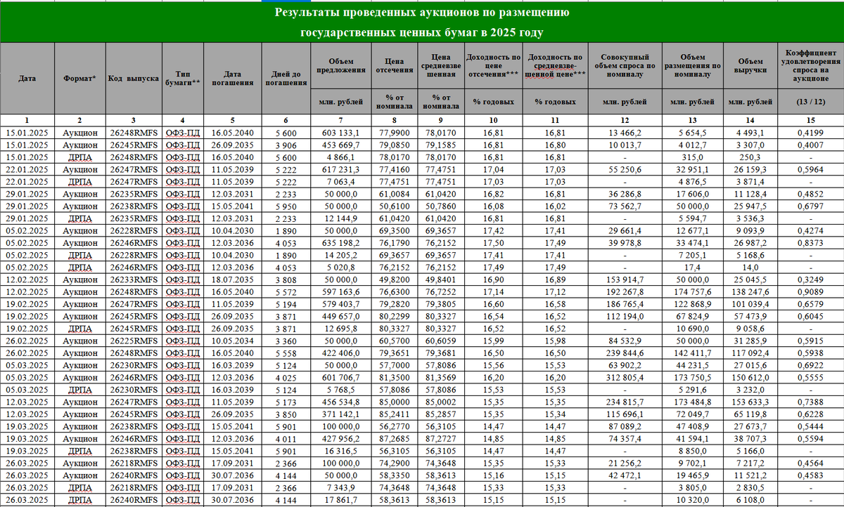 За январь-ноябрь 2025 года: Минфин получил с рынка ОФЗ на 2 248 млрд руб больше, чем выплатил инвесторам. За весь 2025 год Минфин РФ разместил следующие выпуски ОФЗ, выручив 6983 млрд руб. При этом в январе было выплачено: 628 млрд руб в феврале: 71.5 млрд руб. в марте: 469 млрд руб. в апреле: 235 млрд руб. в мае: 177 млрд руб. в июне: 409 млрд. руб. в июле: 697 млрд. руб. в августе: 74 млрд. руб. в сентябре: 515 млрд. руб. в октябре: 297 млрд. руб. в ноябре: 662 млрд. руб. в декабре: 466 млрд. руб. В итоге за год выплаты по ОФЗ составили 4 706 млрд. руб. Общий положительный баланс погашений/размещений составил 2 277 млрд руб. Диаграммы по балансу рынка ОФЗ: