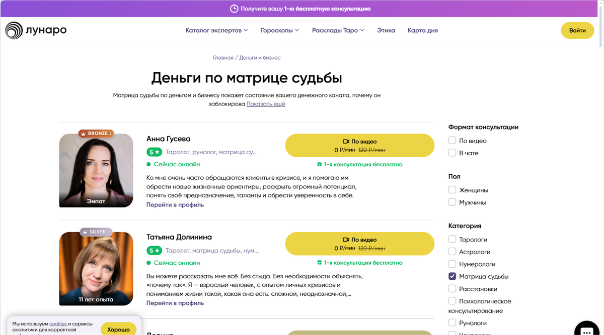 Сервис Lunaro.ru дает доступ к консультациям тарологов, которые могут проанализировать финансовые вопросы через расклады Таро.