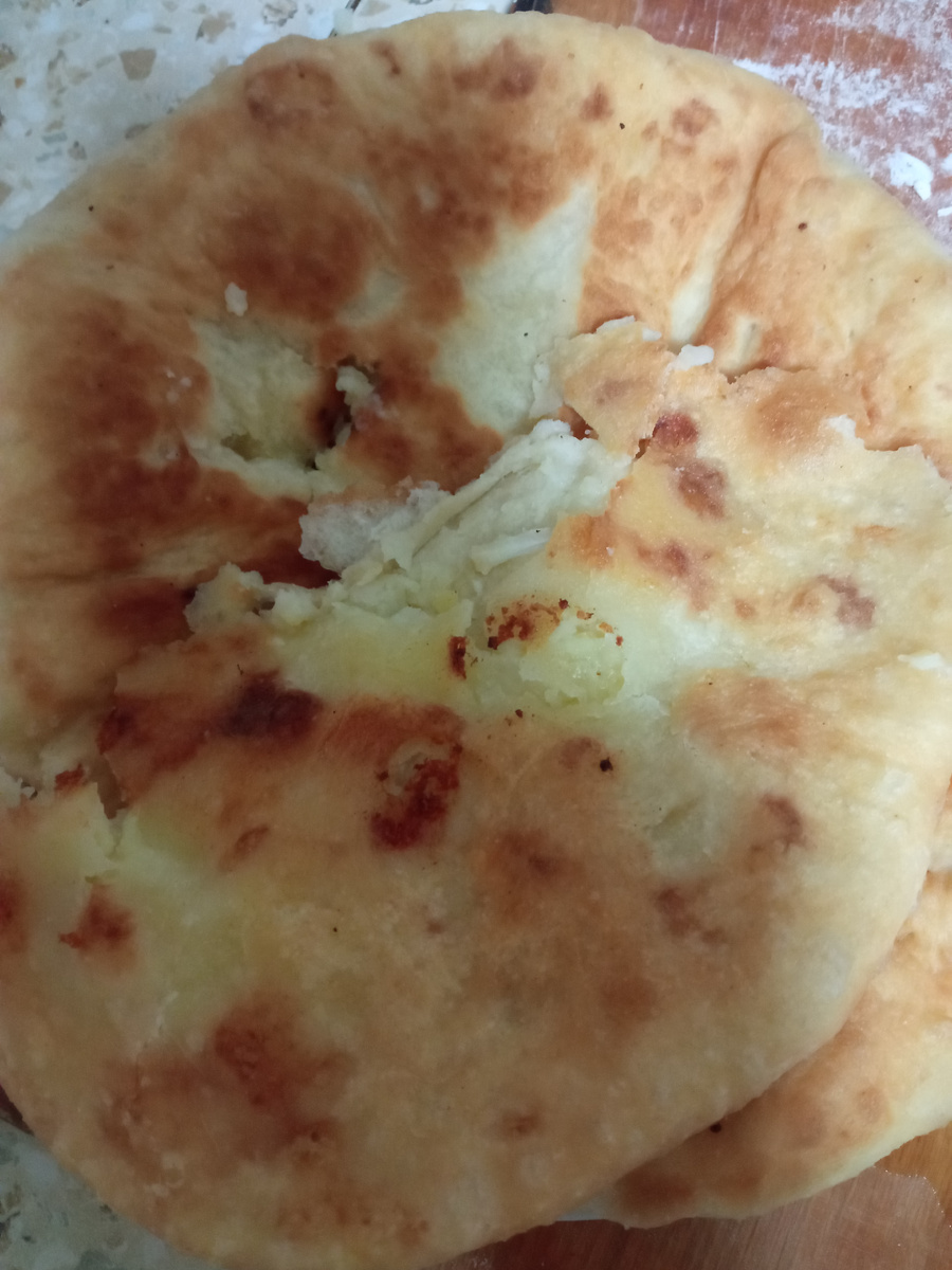 Кто называет осетинский пирог, у нас это осетинская лепёшка. Внутри данной лепёшки начинка. Это очень вкусно. И к ней подаётся соус. Сегодня мы приготовили лепёшку с картофелем. И подали под него соус Тар-тар. Для теста: Маргарин - 50 грамм. Молоко - 250 грамм Яйцо - 1 шт Мука - 500 грамм Сухие дрожжи - 10-12 грамм Соль -3 грамма Начинка: Картофель отварной - пюре. Зелень Лук репчатый пассированный Можно сыр добавить, осетинский или адыгейский. Соль - 2 грамма Соус: Майонез. Немного нарубите огурчика, два колёсика тонких хватит, либо добавьте 2 чайной ложки рассола. Мелко нарубите укропа, кинзы. Приготовление: Раскатайте лепёшку, внутрь положите начинку. Не жалейте. После накройте второй лепёшкой. Соедините по кругу. И вновь обе лепёшки с начинкой, раскатайте или примните похлопыванием в лепёшку. И на сковоро