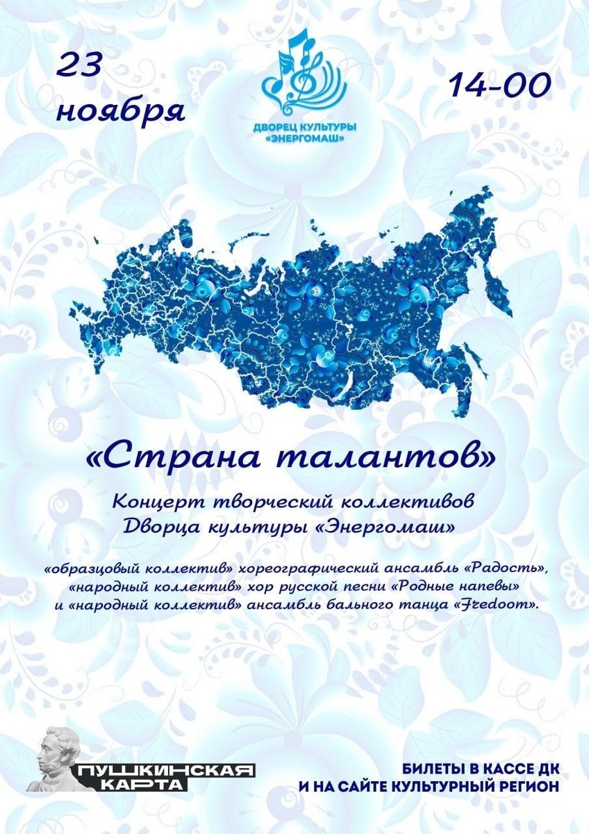 Приглашаем на душевный концерт «Страна талантов»! 🎶 23 ноября в 14:00 Дворец культуры «Энергомаш» распахнёт свои двери навстречу теплу, искренности и живой атмосфере народного творчества! На сцене — всеми любимые творческие коллективы ДК «Энергомаш»: ✨ Образцовый коллектив - хореографический ансамбль «Радость» — ссаядаль, энергия и хореографическое мастерство! 🎶 Народный коллектив — хор русской песни «Родные напевы» — душевные мелодии и богатое наследие русской песенной культуры! 💃 Народный коллектив — ансамбль бального танца «Fredoom» — изящество, страсть и ритм хореографии! Это будет настоящий праздник души — наполненный радостью, талантом и теплом родного дома. Приходите всей семьёй! 🎟 Билеты уже в продаже: — в кассе Дворца культуры «Энергомаш» — на портале [Культурный регион]( https://bel.cultreg.ru/events/534263/koncert-strana-talantov ) 💳 Оплата возможна с использованием Пушкинской карты! Пусть звучит музыка сердец — «Страна талантов» ждёт вас!