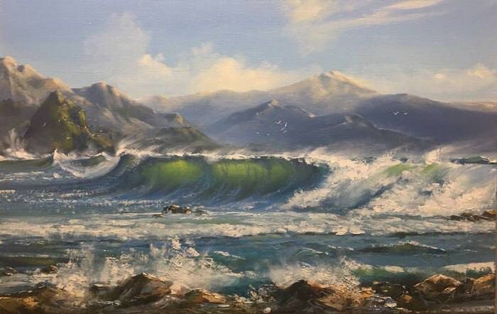 Виктор Юшкевич "Величие моря", 2021 Картина написана в жанре морского пейзажа и выполнена в стиле реализма с элементами гиперреализма. Юшкевич — беларуский художник, родившийся в 1961 году в Пинске, который окончил художественное училище в Кобрине. За свою творческую карьеру он создал более 3000 картин, многие из которых посвящены морю. Работы Юшкевича написаны акриловыми красками на холсте, что позволяет передать яркость и насыщенность цветов, а также игру света на воде. Эта картина сочетает в себе художническую виртуозность и романтическое восприятие природы, подчеркивая величие и бескрайность морской поверхности.