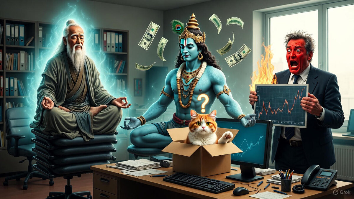 Сцена: Флагманский офис. Напротив Шефа (в поту и с графиками) сидят трое: Лао-цзы (спокойно пьет чай), Кришна (улыбается) и, что шокирует, Кот Шрёдингера (сидит в коробке, которая одновременно открыта и закрыта).