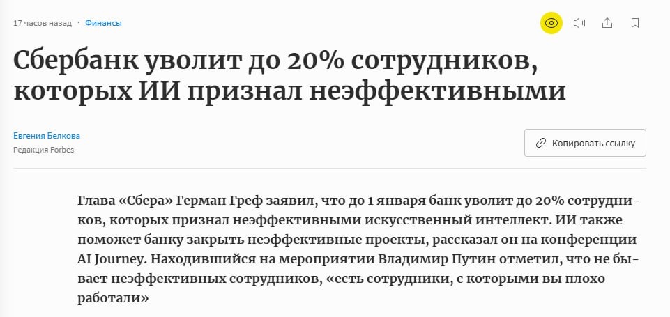 🤖 Сбер уволит до 20% сотрудников — по решению ИИ Когда AI буквально увольняет ИТ-шников. Глава Сбера Герман Греф заявил: к 1 января 2026 года банк уволит до 20% сотрудников, которых ИИ признал «неэффективными». ИИ также будет закрывать «неэффективные проекты» — так сокращают ресурсы. 💡 Это не просто слова — это критика системы. Если ИИ решает, кто «лишний», кто отвечает за его настройку? Кто оценивает, что значит «эффективность» — продажи, скорость, вовлечённость? 📊 По данным Forbes: — Сбер уже сократил >13 500 человек с начала 2025. — ИИ и GigaChat стали главными «оптимизаторами». — McKinsey прогнозирует: к 2030 году ИИ заменит 400–800 млн работников по миру. ⚠️ А 75% офисных сотрудников уже испытывают ИИ-тревогу — боятся потерять работу. 👉 Вопрос не в том, сможет ли ИИ уволить. А в том: должен ли он решать, кто остаётся, а кто — нет? Ампилов про ИТ: https://dzen.ru/id/623d938f380f3715018b6e3c