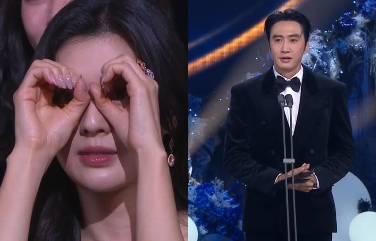 Одна из любимейших пар корейских знаменитостей, Ли Кван Су и Ли Сон Бин, разделила весёлый и трогательный момент на церемонии награждения Blue Dragon Film Awards 2025, которая состоялась 19 ноября. Момент, ставший вирусным, произошёл, когда Ли Кван Су вышел на сцену со своим близким другом Ким У Бином, чтобы вручить награду в категории «Лучший режиссёр». Смотрите также: Победители 46-й премии Blue Dragon Film Awards Когда оба актёра поднялись на сцену, камера сразу же запечатлела Ли Сон Бин, находящуюся в зрительском зале, где она присутствовала в качестве номинанта в категории «Лучшая новая актриса» за роль в фильме «Паранормальное явление. Шум». Заметив, что её показывают на большом экане, Ли Сон Бин в шутку изобразила руками бинокль, чтобы получше рассмотреть своего парня Ли Кван Су, вызвав волну смеха во всём зале. Ким У Бин и Ли Кван Су тоже рассмеялись и застенчиво отвернулись, увидев её реакцию. Один из нетизенов поделился этим моментом в социальной сети, написав: «Камера показа
