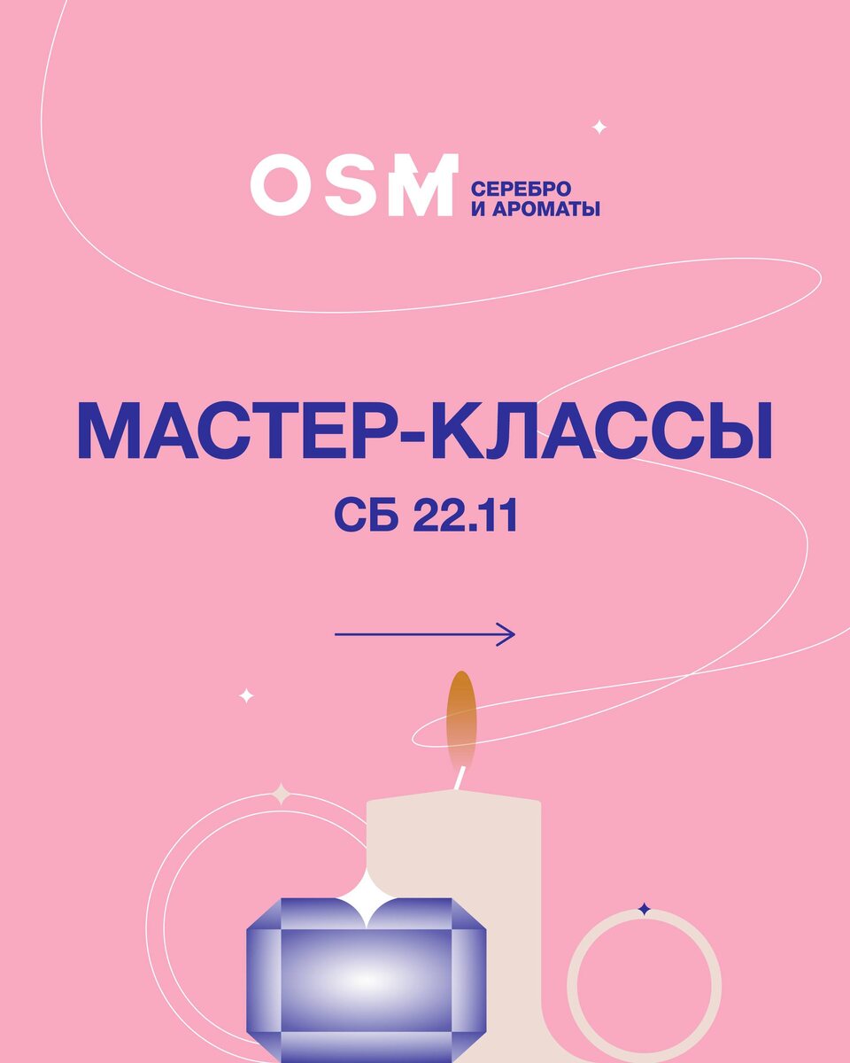 Тематические мастер-классы на OSM Серебро и ароматы. Подробная программа в карусели 📎 22 ноября: ✨Мастер классы по свечеварению, изготовление ароматических саше и диффузоров для дома совместно с мастерской Istoki.space ✨"Коллаж и ассамбляж" от мастерской «Коллажный округ» 23 ноября: ✨Аромабар AROMALAGE ✨"Украшения из эпоксидной смолы: магия мгновенного застывания" вместе с брендом «Истэлек» ✨"Магия серебряного тиснения " от Школы искусств КФУ Предварительная регистрация не требуется — участие в порядке живой очереди. OSM: серебро и ароматы 22 и 23 ноября • 11:00 — 20:00 📍 Креативный кластер «Адонис» • ул. Профсоюзная, 3 Вход свободный / 0+