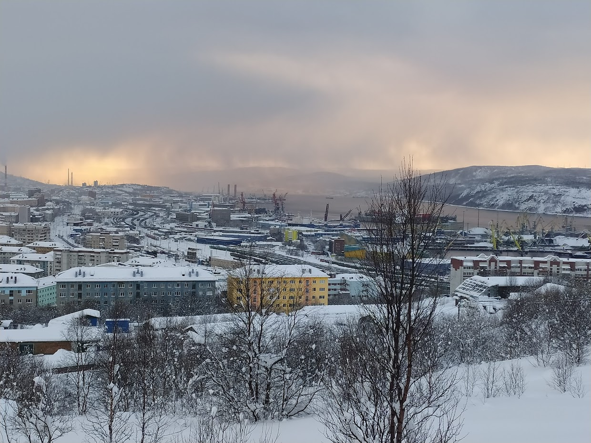 Отсюда открывается вид на весь Мурманск: порт, сухогрузы, сопки, дома, террасами уходящие вниз. Город живёт — шумит, светится, работает.