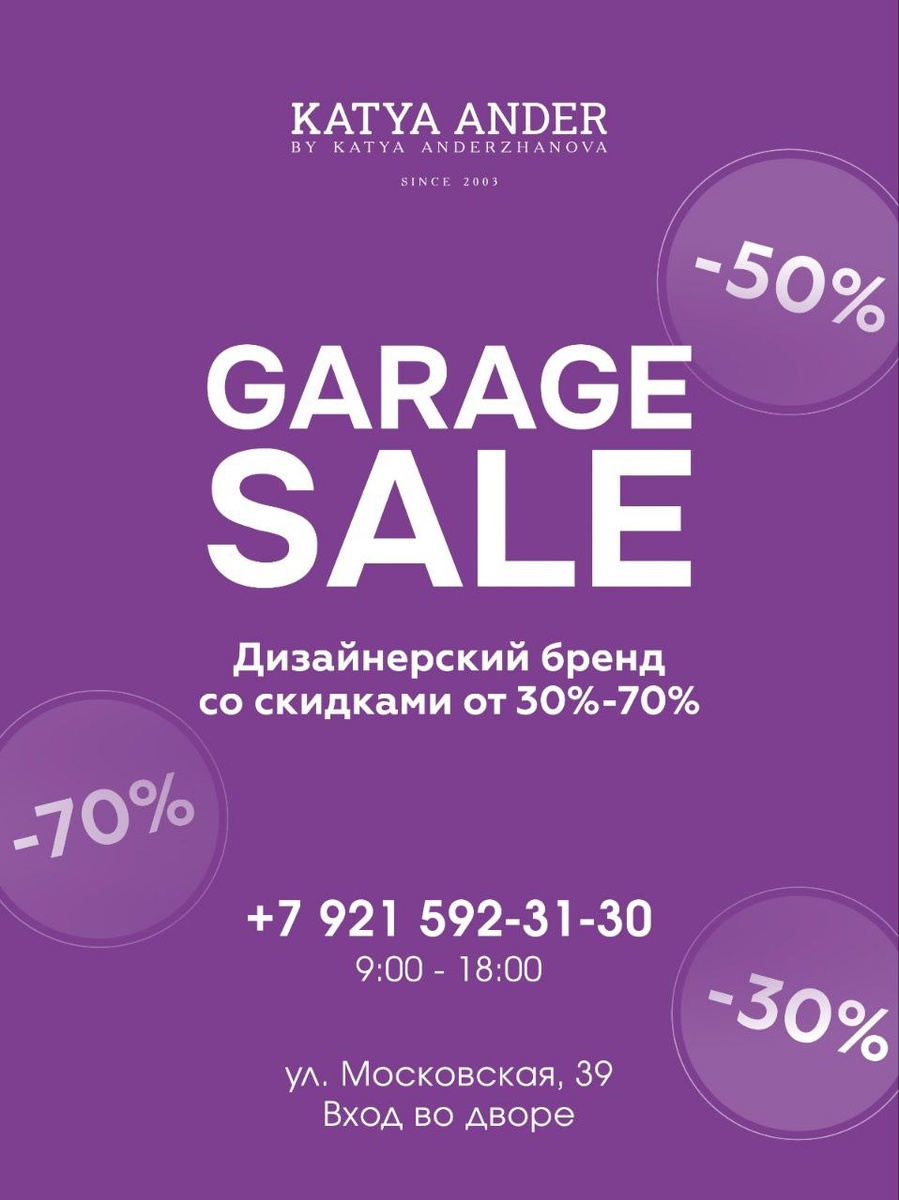 Большие скидки в шоуруме Katya Ander! 💜✨ Милые девушки, продолжаем наш Garage Sale с очень приятными скидками! Ждём вас на нашем новом адресе: СПБ, г. Пушкин, ул. Московская, 39 💐 Вас ждут: • Рейлы с фиксированной стоимостью • Скидки на более чем 70% позиций (кроме новой коллекции) Самое время обновить гардероб по приятным ценам! 🔥 Бренд в соц. сетях: 📱 Instagram 📱 ВКонтакте 📱 Pinterest