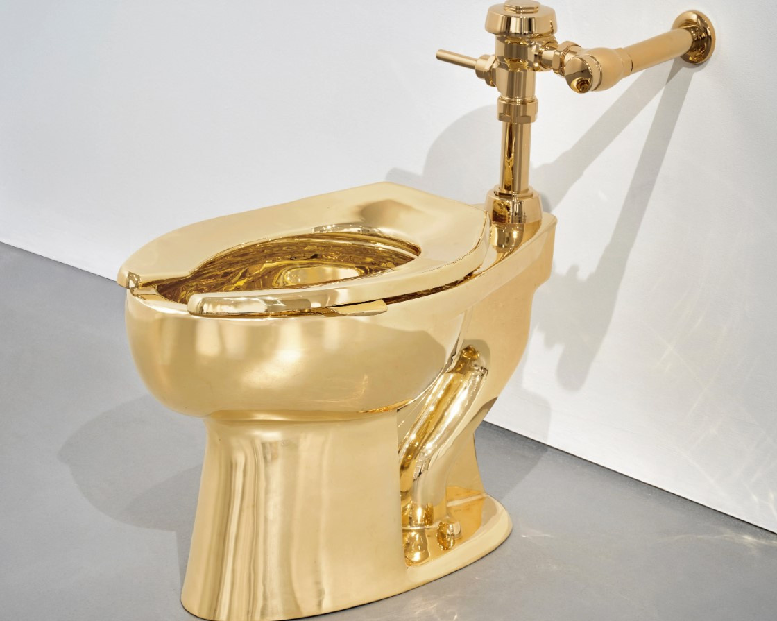 На аукционе продали 100-килограммовый золотой унитаз из цельного 18-каратного золота за $12,1 млн. Его автор, художник Маурицио Каттелан, известен другой работой — банан, приклеенный скотчем к стене, прошлой осенью был продан на аукционе Sotheby's более чем за $6 миллионов. Унитаз, выполненный из 100 килограммов золота, был одним из участников вечерних торгов Sotheby's 18 ноября, пишет New York Post. Стартовая цена на торгах — $10 миллионов, согласно текущим ценам на драгоценный металл, но аукционный дом рассчитывал выручить бо́льшую сумму. Первоначально Каттелан придумал арт-объект как форму социального комментария, назвав его «Америка», чтобы подчеркнуть абсурдность того, какие места в музее считаются священными, а какие — нет. С 8 ноября посетители смогут увидеть унитаз, который установят в туалете здания Breuer Building, новой штаб-квартиры Sotheby's. Гостям напоминают: смотреть можно, но нельзя смывать. Хотя на самом деле объект функционален. «Мы не хотим, чтобы люди сидели на про