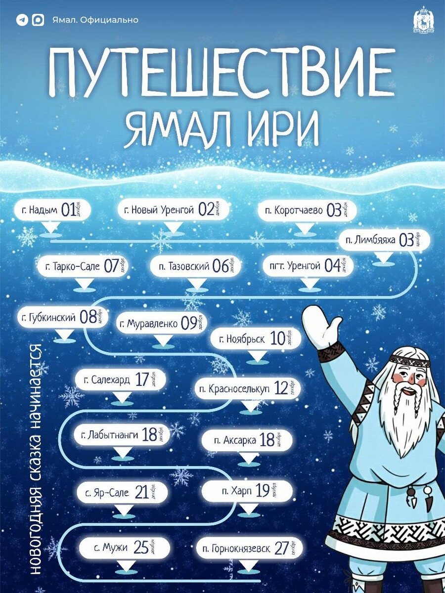 ✨Ямал Ири отправляется в большое путешествие Главный северный волшебник начинает свой ежегодный предновогодний маршрут с Надыма, чтобы лично поздравить юных ямальцев. В этом году ему предстоит преодолеть 1500 километров и посетить 18 населённых пунктов. Передвигаться ямальский Дед Мороз будет на всём, что есть в арсенале: на расписном автобусе, ТРЭКОЛе и даже вертолёте. Следите за путешествием Ямал Ири! 📲 ЯМАЛ. Официально | Подписывайтесь на нас в MAX