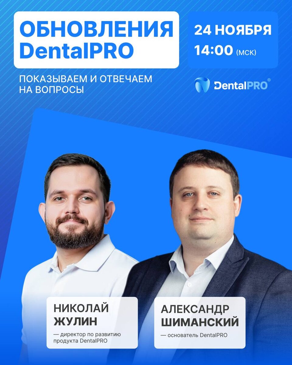 Маленькие обновления — большие возможности для вашей клиники! ✨ ✔️ Два свежих релиза DentalPRO уже помогают работать быстрее и удобнее. Узнайте, что нового, на бесплатном вебинаре «Обновления DentalPRO: показываем и отвечаем на вопросы». Вы узнаете: ✅ Какие новые функции экономят время и упрощают работу клиники? ✅ Что готовится в следующих обновлениях и как это улучшит вашу работу? ✅ Как вы можете влиять на развитие системы? Эксперты: 🎼 Александр Шиманский — основатель DentalPRO, специалист в области автоматизации бизнес-процессов в стоматологии. 🎼 Николай Жулин — директор по развитию продукта DentalPRO. 🗓 24 ноября — понедельник ⏲ 14:00 (МСК) Успейте зарегистрироваться на вебинар, чтобы задать вопросы в прямом эфире 🎙 #Вебинары