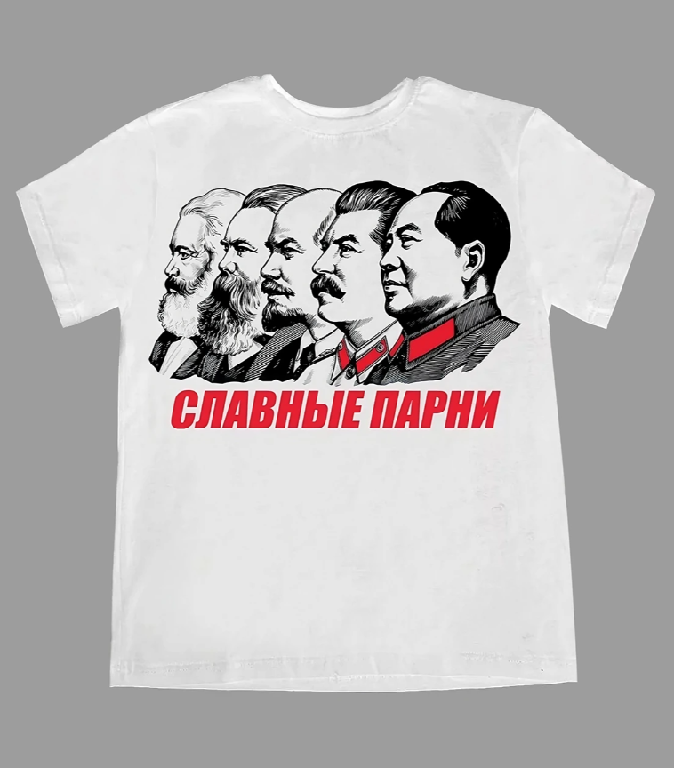 Красный мерч: На футболке китайский плакат 50-х годов: Т.е. своих смыслов и символов у копирайтеров нет. Они тупо перепечатывают старые агитки. Обратите внимание на последовательность: от Маркса до Мао. Коммунизм начинается в Европе, развивается в России, затем приходит в Китай. Хрущёва в этой схеме нет: его считали "ревизионистом" что китайцы тогда, что наши красные инфоцыгане сейчас. Им великий Сталин милее: Послушаем, что говорил "славный парень" Мао Цзе-дун на втором пленуме ЦК КПК в 1958 году: Цинь Ши-хуан закопал живьем всего только 460 конфуцианцев. Однако ему далеко до нас. Мы во время чистки расправились с несколькими десятками тысяч человек. Мы поступили как десять Цинь Ши-хуанов. Я утверждаю, что мы почище Цинь Ши-хуана. Тот закопал 460 человек, а мы 46 000, в 100 раз больше... Нас ругают, называют циньшихуанами, узурпаторами. Мы это все признаем и считаем, что еще мало сделали в этом отношении, можно сделать еще больше. Здесь речь только про "чистки" - внутрипарти