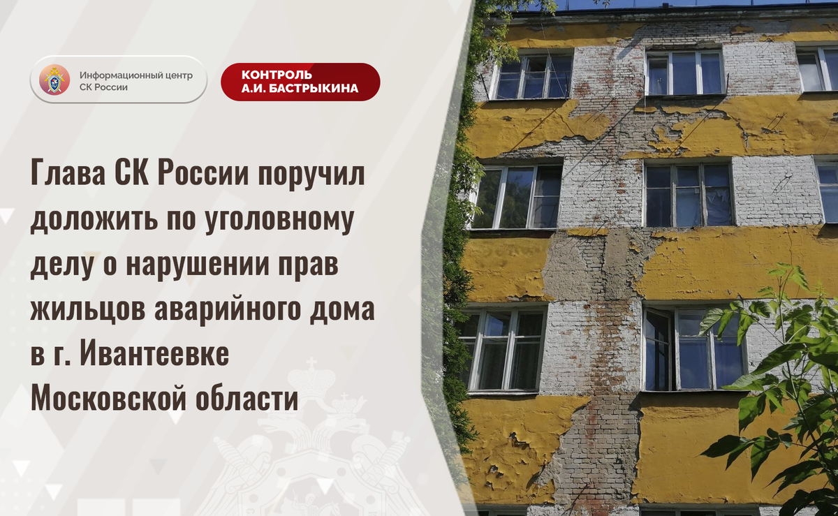 Глава СК России поручил доложить по уголовному делу о нарушении прав жильцов аварийного дома в г. Ивантеевке Московской области В Информационный центр СК России поступило обращение по вопросу длительного нерасселения жильцов многоквартирного дома на улице Адмирала Жильцова в городе Ивантеевке Московской области. Здание 1928 года постройки признано аварийным в 2022 году из-за разрушающихся несущих конструкций и кладки фасада, а также трещин в стенах и изношенности коммуникационных систем. Однако до настоящего времени мер к предоставлению гражданам благоустроенных жилых помещений не принимается, срок расселения постоянно переносится. Многочисленные обращения в компетентные органы результатов не принесли. Указанная ситуация освещалась в социальной сети. В ГСУ СК России по Московской области возбуждено уголовное дело. Председатель Следственного комитета Российской Федерации Александр Иванович Бастрыкин поручил руководителю ГСУ СК России по Московской области Ярославу Александровичу Яковле