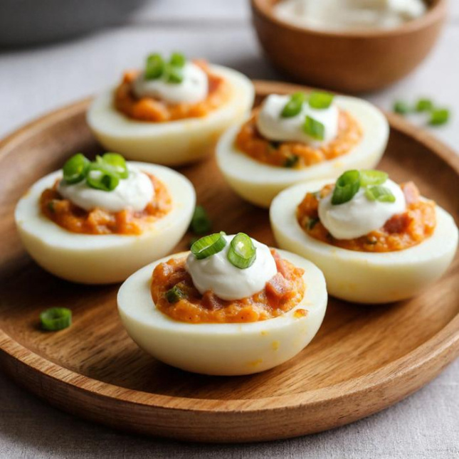 Нежные фаршированные яйца, запечённые в духовке до золотистой корочки — сытная и привлекательная закуска, идеально подходящая как для семейного обеда, так и для праздничного стола.