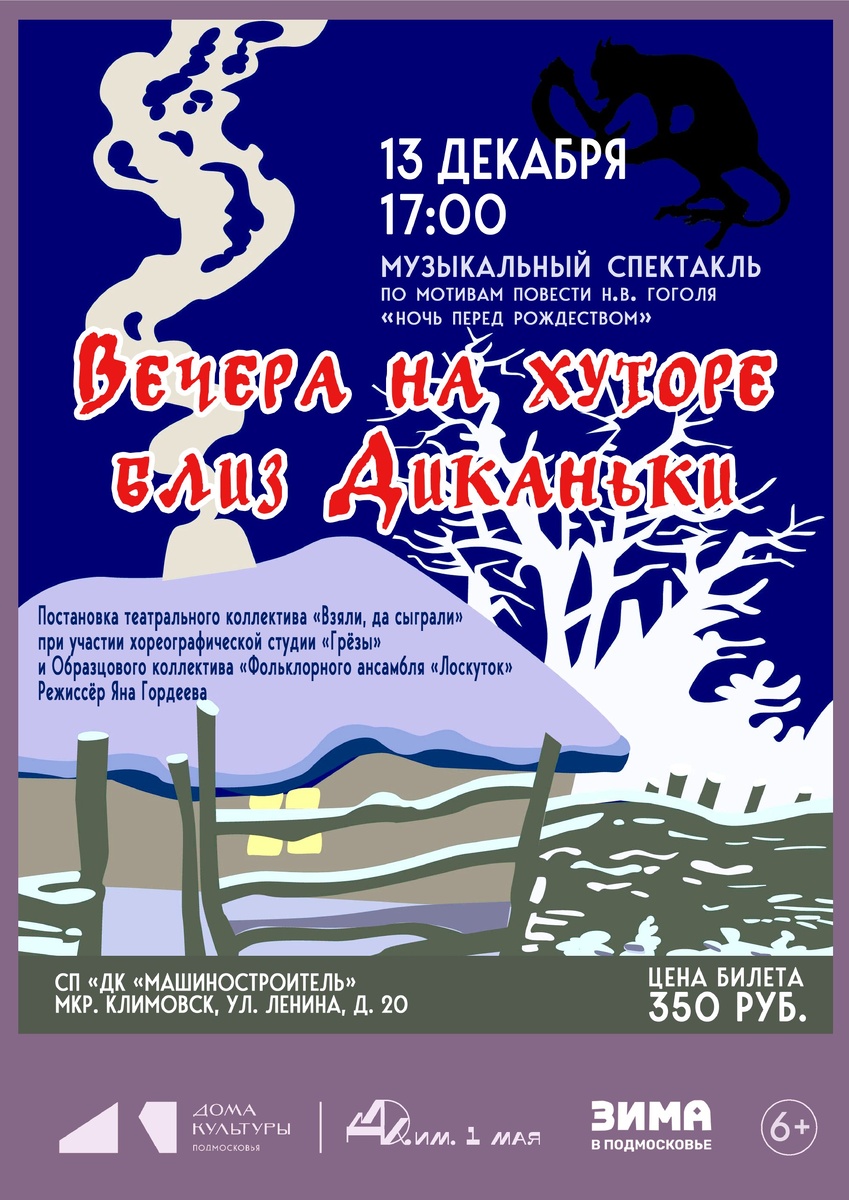 ✨ Музыкальный спектакль «Вечера на хуторе близ Диканьки» 🌛по мотивам повести Н.В. Гоголя «Ночь перед Рождеством» в исполнении участников театрального коллектива «Взяли, да сыграли». 🎬При участии: ХС «Грёзы», руководители Наталья Данилова и Олеся Терновская и Образцового коллектива «Фольклорного ансамбля «Лоскуток», руководитель Виктория» 🚫 Возраст: 0+ 📆 13.12.2025 🕒 17:00 🏢 ДК "Машиностроитель" 📍 г.о. Подольск, мкр-Климовск, ул. Ленина, 20 💰 Цена: 350 ₽ 🎫 Купить билет: https://clck.ru/3QAVoR ⭐Поддержать канал голосом 🍰Где поесть в Подольске ✅ Мероприятия Подольск https://dzen.ru/id/66ed500f7b5671493eca3fd6 http://vk.com/podolsk_events http://dzen.ru/podolsk_events