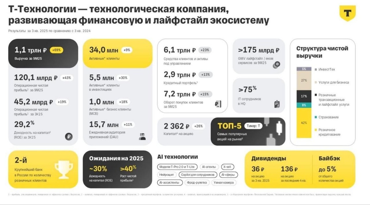 Богатые богатеют - всё по плану. 🏦 Отчёт #T Т-Технологии за 9 месяцев - Банкиры стригут и рубят прибыли при любых ставках 🤑 Отдача на капитал ROE 29,2% за 9 месяцев при плане 30% по году, рост чистой прибыли - план +40% г/г. 🤯 Как можно и дальше показывать такие цифры прибыли при полном отсутствии сервиса и похабному отношению к любому клиенту - вечная загадка. Дальше отчёт можно не смотреть и не читать, кроме нескольких цифр. Капитал сейчас 634 млрд.рублей, что на 1 акцию из всего 268 млн.штук даёт нам сейчас уже аж 2365 рублей на акцию. При плановом ROE=30% - это будет грубо 3070 рублей через год (дивиденды еще будут платить, так что меньше). В офз и банках дают ~15% в год. Сейчас коэффициент P/Bv= 1,29. Вот эта вилка в 1 текущий -форвардный капитал и есть общий базовый ориентир. Что делают большие деньги? А теперь смотрите внимательно, что делает в таких случаях менеджмент олигарха, самого опытного банкира- Мажоритария.