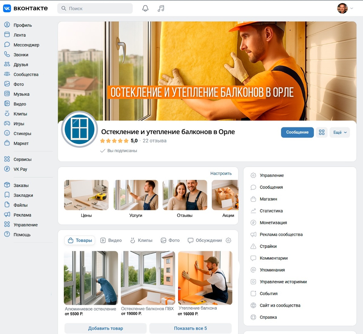 Ко мне обратился владелец компании, которая занимается остеклением и утеплением балконов в Орле. У компании был сайт и профиль во ВКонтакте, но они не приносили клиентов — заявки поступали только через сарафанное радио и старые объявления. Нужно было создать поток обращений через соцсети, показать профессионализм и надёжность, и при этом не выходить за рамки небольшого бюджета.