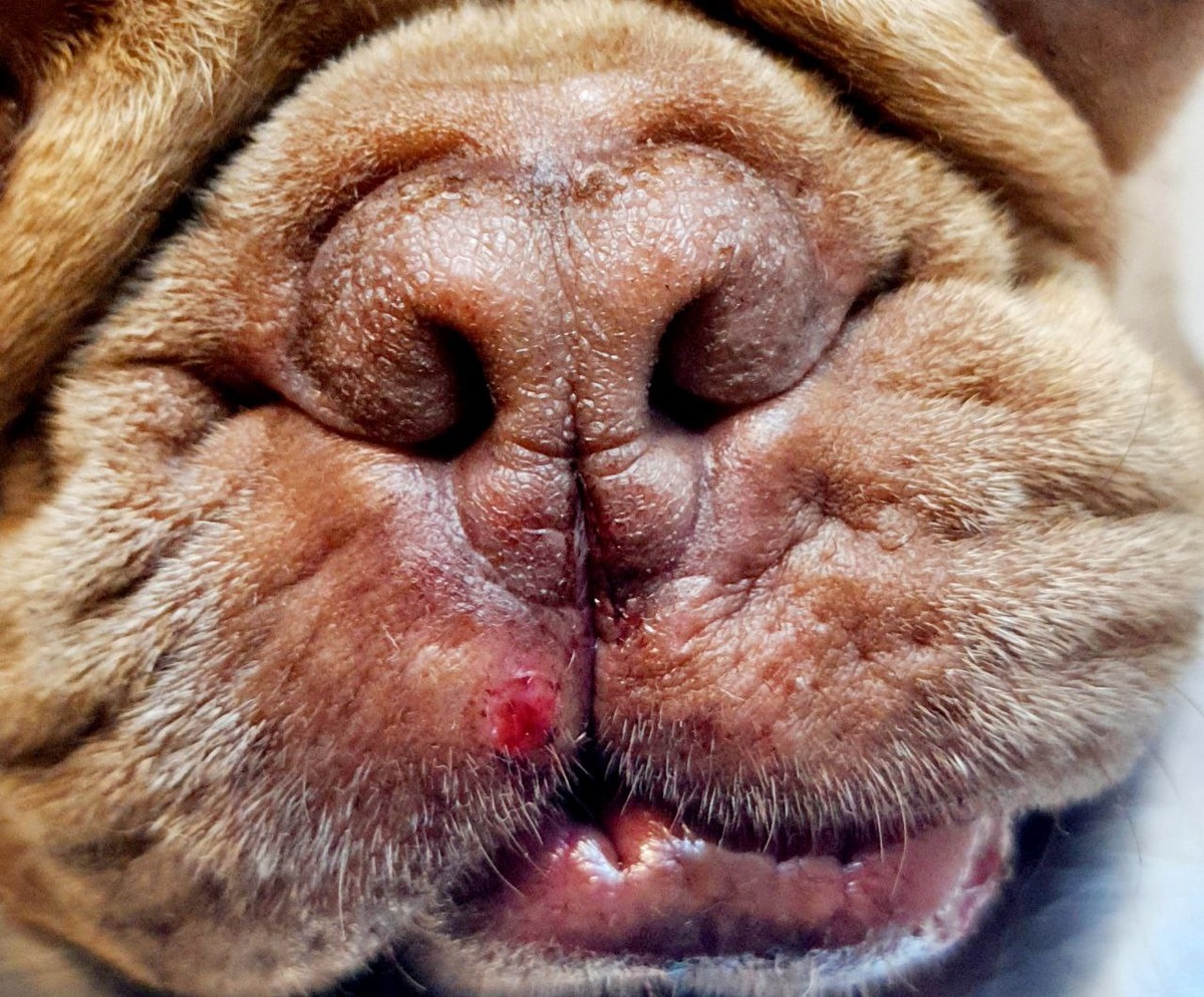 Начало папилломатозного роста на верхней губе. Быстрый и интенсивный рост по поверхности кожи остановлен с использованием коагулятора. Параллельно проводилось терапевтическое лечение. Второй снимок сделан через 9 суток после процедуры удаления. Прогноз на рецидив осторожный. А если отвлечься от всяческих патологий, то можно увидеть просто замечательный орган обоняния (удивительное сверх сложно устроенное творение природы) и понять почему владельцы иногда целуют собаку, именно, в нос.