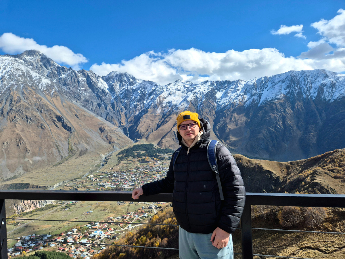 После насыщенного дня, проведенного в Тбилиси, настало время открыть для себя другую, величественную Грузию — горную. Для этого мы поехали в район Казбеги, к легендарному Храму Святой Троицы. Признаюсь, изначально меня слегка смущала перспектива трехчасовой поездки в одну сторону, но, как показала практика, каждую минуту в пути можно считать оправданной и бесценной. Этот маршрут включал три ключевые точки, и мы решили начать с самой дальней и главной из них. Отмечу, дорога в горах по Военно-Грузинской дороге — это отдельное приключение. Пейзажи за окном менялись с кинематографической скоростью: густой туман, окутывающий ущелья, внезапно рассеивался, открывая взгляду ослепительные снежные вершины, пронзающие лазурное небо. По пути мы сделали одну короткую остановку вблизи горнолыжного курорта Гудаури, чтобы в полной мере насладиться мощью горных хребтов (смотри видео). Спустя три часа мы достигли главной цели — Храм Святой Троицы в Гергети, возвышающийся на высоте 2170 метров, — зр