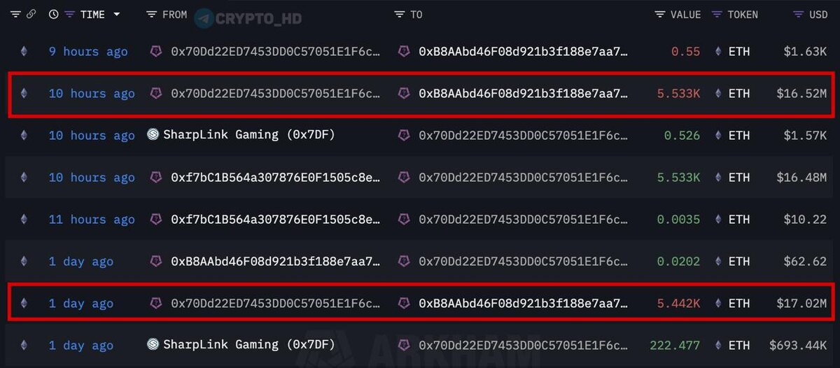 😬 SharpLink Gaming избавляется от #ETH ? Компания уже перевела 10,975 #ETH ($33,5m) на OTC-платформу Galaxy Digital за последние сутки – Arkham ❗️Тем временем убыток BitMine по ETH превысил $3,6b – CryptoQuant Ранее: - Виталик Бутерин против - $3b в стейкинге - покупают ETH Crypto Headlines