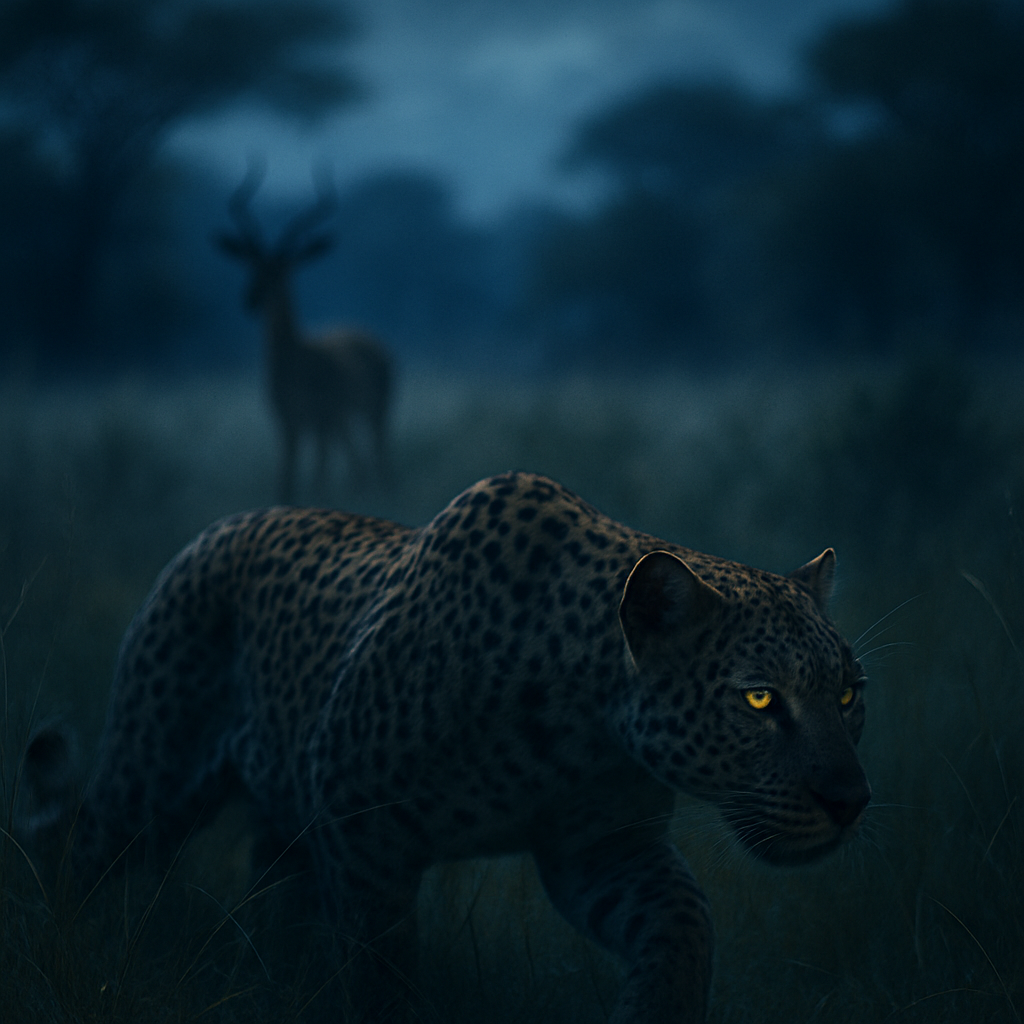 Трудно представить себе животное, которое так мастерски исчезает в ночи, как леопард. «Леопарды и ночная охота» — тема, которой я заинтересовался ещё подростком, когда впервые увидел в книге по зоологии снимок: тёмная саванна, лунный свет и едва заметная тень, в которой угадывался силуэт хищника. Сейчас, живя в Нижегородской области и работая над статьями о поведении животных, я всё чаще возвращаюсь к вопросу: как леопардам удаётся быть невидимыми, даже если посмотреть на них в упор?