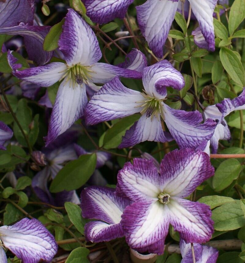 Клематис Ай Эм Леди Джей представляет собой прекрасный вариант для садоводов, стремящихся придать особый шарм своему участку. Это растение способно очаровать любого своими белоснежными цветами с нежным пурпурным оттенком, украшающими сад с начала лета вплоть до осени. Благодаря превосходному иммунитету к заболеваниям и насекомым-вредителям, клематис практически не нуждается в тщательном внимании и заботе. Данный сорт входит в группу Витицелла и прекрасно подходит для вертикального озеленения заборов, беседок, пергол и других декоративных конструкций. Обрезается клематис достаточно сильно (группа 3), однако быстро восстанавливается, демонстрируя энергичный рост. Цветение куста весьма эффектно: крупные изящные бутоны белого цвета украшены тонкими фиолетовыми линиями вдоль края каждого лепестка. Размер цветков составляет примерно 2,5×4 см, концы лепестков немного загнуты наружу. Центральный пучок тычинок окрашен в светло-зелёный оттенок, а ярко-красные пыльники придают особую выразитель