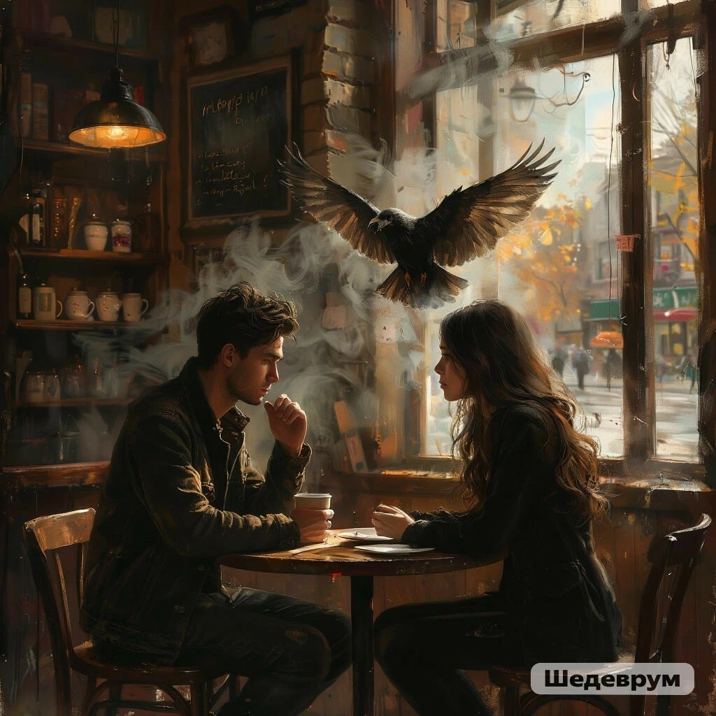 «Боже, что с нами случилось?.. Мы сидим в кафе на Земле, притихшей от тоски… Сердце намертво разбилось, Разлетясь повсюду в труху, всем чувствам вопреки. Взгляд твой насквозь выжигает. Не смотри вот так на меня, молю больной душой! С нами всё вокруг страдает. Что случилось с нами и с нашей раненой судьбой? Не смотри так, умоляю! Ты же видишь, мне тяжело под гнётом глаз твоих. Вновь и вновь я повторяю: Не должно быть в этой Вселенной, слышишь, нас двоих… Даже встреча нас — ошибка В этом небольшом под небесным сумраком кафе. Здесь и впрямь чужда улыбка. Как же быть, когда лишь фрагменты краха в голове?.. Ты спросил: что с нами станет? Я клянусь, не знаю, и мне, наверно, не узнать. Ты да я — как тень в тумане. Остаётся только безмолвно в муках дней стонать… Нас сестра твоя разбила, Чья ревнивость стала последней каплей для меня. Что ж ты, Иза, натворила! Беспощадно судеб задула сразу два огня. За окном всё те же тучи. Опустели стулья. Остывший кофе недопит. Взор давно уж твой не жг