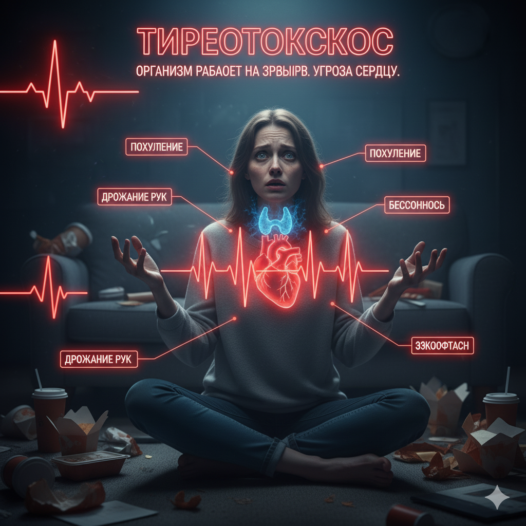 ЧТО БУДЕТ, ЕСЛИ... женщина будет игнорировать постоянное ощущение усталости, резкое похудение при нормальном аппетите и дрожание рук — история Дарьи, которая считала это "стрессом от работы" «Дарья считала, что ее постоянный голод и похудение — это просто "хороший метаболизм". Эндокринолог объяснил, что ее организм "работает на разрыв", и зовут это Тиреотоксикоз (Гипертиреоз)». 🎬 Эпизод 1. Энергия и нервозность — маскировка под активность Дарья, 30 лет, заметила, что стала резко терять вес, несмотря на то, что ее аппетит вырос. Она постоянно чувствует внутреннюю дрожь, учащенное сердцебиение (тахикардию) и нервозность. Она убеждала себя, что это просто результат ее "гиперактивности" и высокого темпа жизни. Вместо визита к врачу, она объясняла свое состояние тем, что "наконец-то избавилась от лишних килограммов". — "Даша, ты постоянно дерганая, и руки у тебя трясутся. Может, ты слишком много кофе пьешь?" — спрашивает ее коллега. — "Я просто очень много успеваю! А кофе я и правда любл