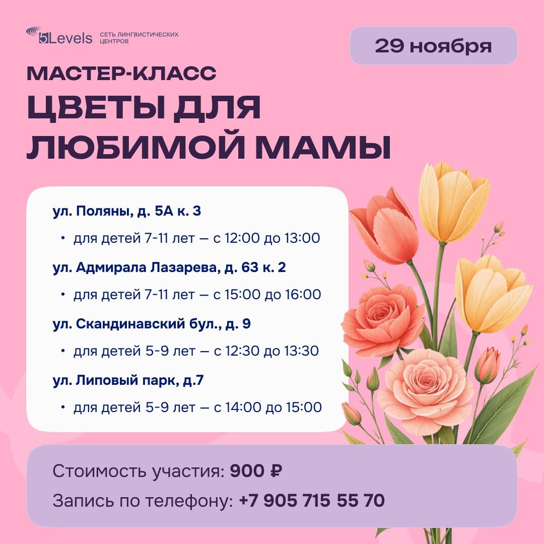 Мастер-класс «Цветы для любимой мамы» 🫶💐 💖 День мамы уже близко! В субботу 29 ноября приготовим сюрприз своими руками для самых любимых и дорогих! А чтобы праздник стал ещё ярче, мы приготовили творческий мастер-класс по созданию поделки «Цветы для любимой мамы»🎨✨ Расписание по нашим центрам 🌺 для детей 7-11 лет: – ул. Поляны, д. 5А к. 3 — с 12:00 до 13:00 – ул. Адмирала Лазарева, д. 63 к. 2 — с 15:00 до 16:00 🌺 для детей 5-9 лет: – ул. Скандинавский бул., д. 9 — с 12:30 до 13:30 – ул. Липовый парк, д.7 — с 14:00 до 15:00 💸 Стоимость: 900 ₽. 📲 Записаться на мастер-класс и задать вопросы: +7 905 715 55 70 или в чате 5Levels