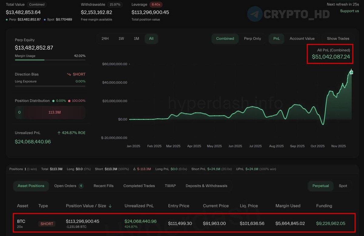 😮 Безумец «0x5D2F» шортит Биткоин уже больше шести месяцев и держит позицию на $113m c нереализованной прибылью $24m (следить