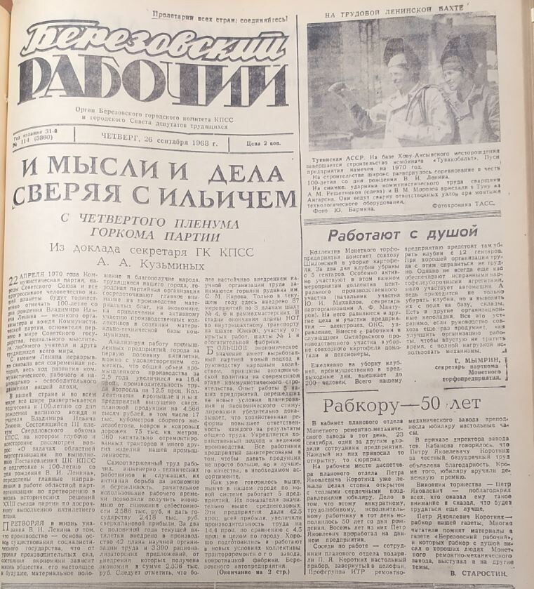 На четвертом пленуме горкома партии были рассмотрены и одобрены мероприятия по подготовке к 100-летию со дня рождения В. И. Ленина. Березовчанам предстояло на всех предприятиях организовать социалистическое соревнование за достойную встречу ленинского юбилея и «обеспечить выполнение пятилетнего плана города по объему производства к 7 ноября 1970 года, по уровню производительности труда – к 22 апреля 1970 года».