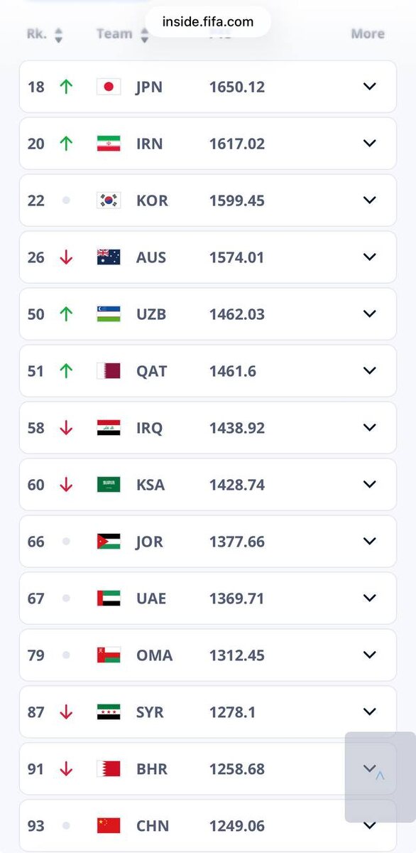 Футбол бўйича Ўзбекистон миллий терма жамоаси ФИФА рейтингида 5 та ўрин кўтарилди ва 50-ўринни эгаллади. Осиёда эса Қатарни қувиб ўтиб, 5-жамоага айландик. Биздан юқорида Япония (18), Эрон (20), Жанубий Корея (22) ва Австралия (26) жой олган. Каналимизга обуна бўлинг ва энг сўнгги янгиликларни кузатиб боринг Jizzaxnews |Тelegram | Facebook | Dzen | YouTubе