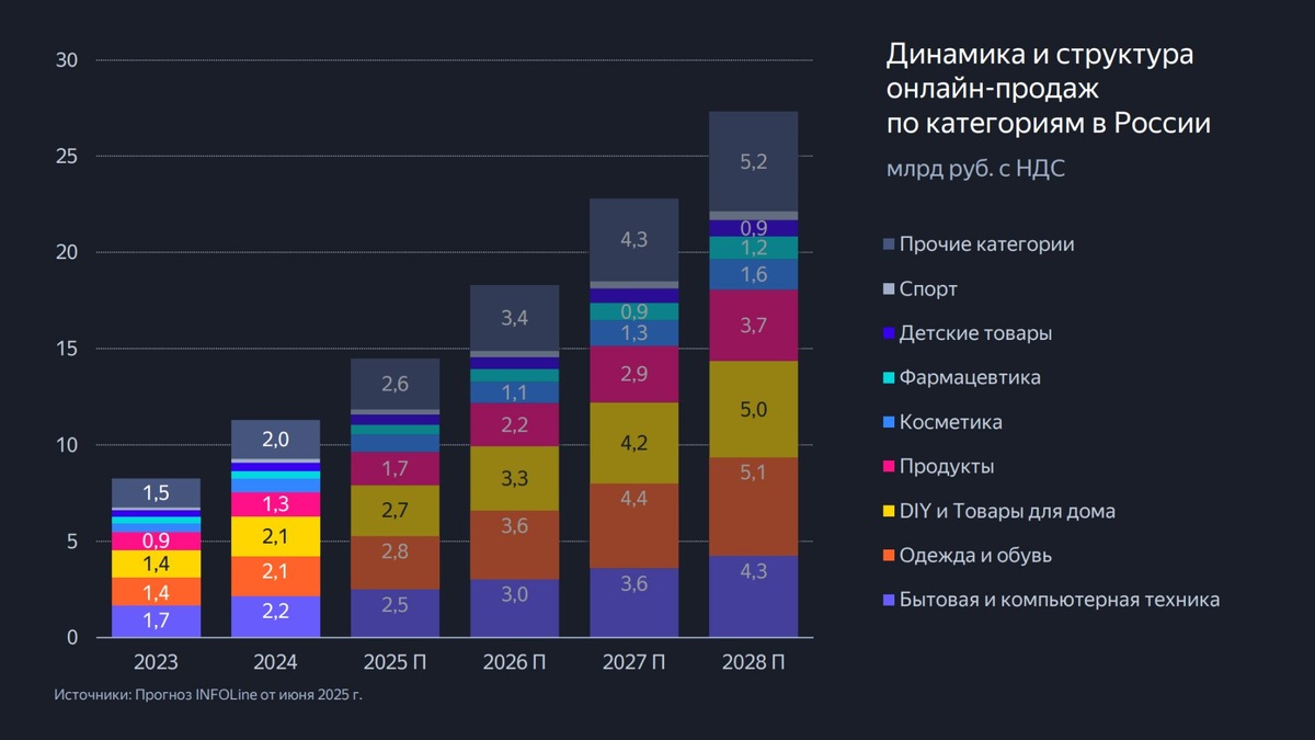 - Рынок взрослеет и диверсифицируется: Снижение доли исторического лидера ("Техника") и опережающий рост "Продуктов" и "Прочих" категорий говорят о зрелости рынка. Онлайн-покупки становятся нормой для всех сфер жизни, а не только для приобретения электроники и одежды.