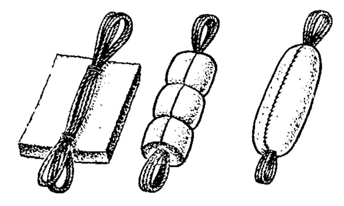 Кранец из поролона Кусок толстого поролона, пористой резины или другого аналогичного материала легко превратить в хороший кранец для катера или яхты. Для этого из тонкого шнура изготовляется небольшая бухточка (как показано на эскизе). Затем при помощи двух связок-бензелей у концов бухточки образуются петли, и она укладывается на поролон. После этого поролон свертывается в трубку и плотно обвязывается шнуром. Остается только обшить его снаружи плотной и прочной тканью (парусина, плащ-палатка, брезент) и кранец готов. Такой кранец удобен тем, что его можно подвесить как за одну петлю — вертикально, так и за две — горизонтально, что бывает необходимо при стоянке у сваи. ⚓️ Мотолодки, катера и яхты
