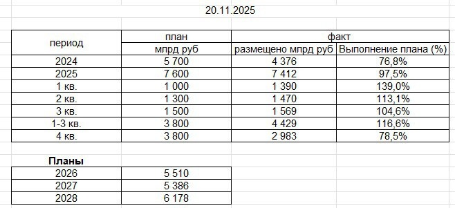 Аукционы ОФЗ итоги мысли выводы Еженедельно по средам Минфин проводит аукционы ОФЗ План Минфина на 4 кв. 2025г увеличен на 2,3 трлн руб.до 3,8 трлн руб. В 4 кв. 12 аукционо, осталось 4 Дефицит бюджета России (прогноз около 5 трлн в 2025г) финансируют через эмиссию ОФЗ. Аукционы по размещению ОФЗ позволяют оценить конъюнктуру рынка и понять, какая ставка необходима для выполнения плана, важно для принятия решения о длине облигаций в портфеле. Растут расходы на обслуживание долга 8,9% расходов бюджета на 2026г запланировано потратить на обслуживание долга. Вывод Ситуация под контролем. Если не будет форс мажора, в 2026г возможно обслуживать гос. долг и финансировать обслуживание долга. Снижение ставки важно для уменьшения стоимости обслуживания долга. Если рубль останется крепким и не повысится инфляция, то тренд на снижение ставки продолжится. Сильное снижение опасно, т.к. люди могут снимать деньги с вкладов (рост спроса, рост инфляции). Думаю, в декабре ЦБ снизит ставку на 0,5%