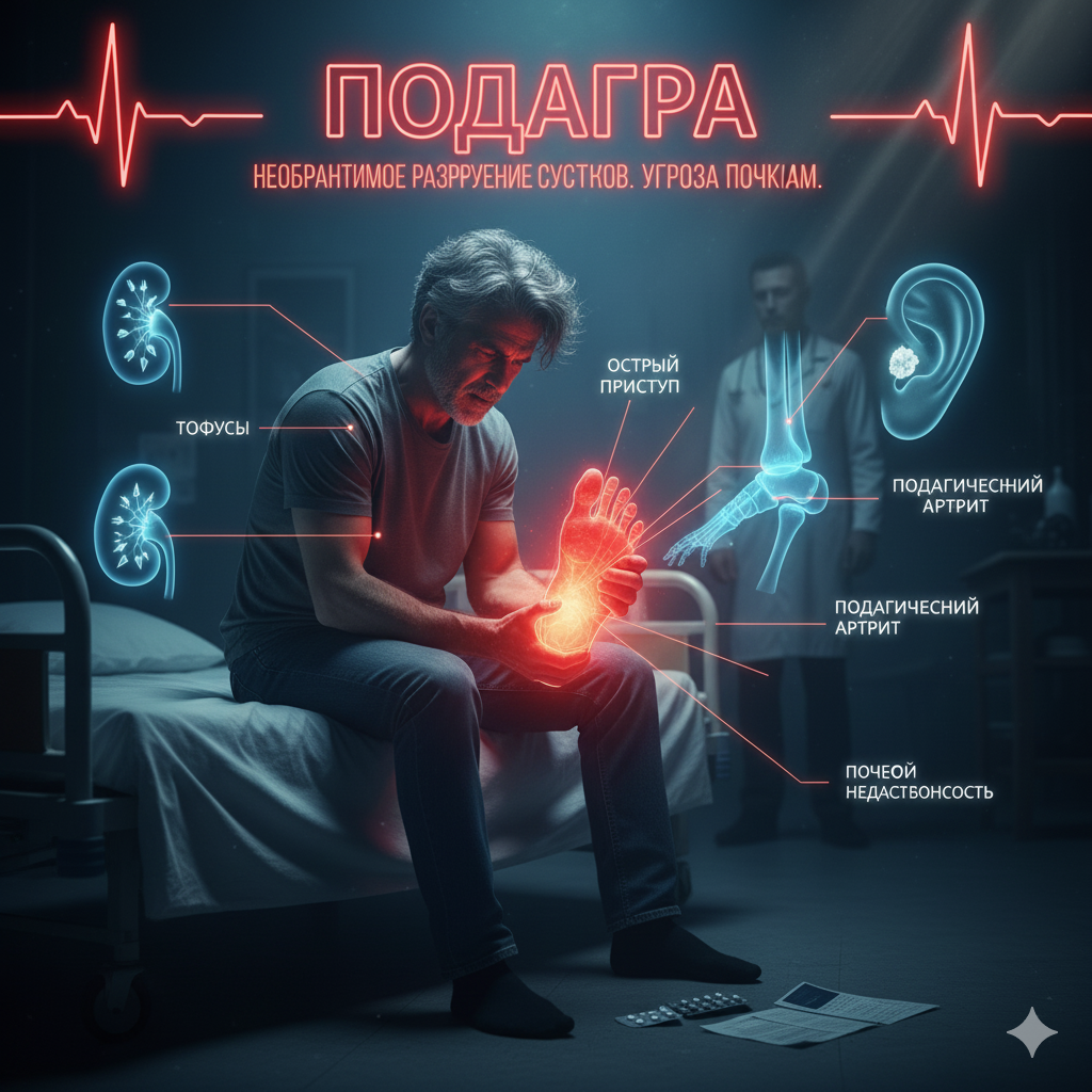Ревматолог объяснил, что его нежелание лечить подагру привело к тому, что кристаллы мочевой кислоты не только разрушили суставы (вызвав подагрический артрит), но и отложились в почечных канальцах. Это вызвало интерстициальный нефрит и почечную недостаточность. Врачу пришлось назначить ему пожизненную терапию, направленную на снижение уровня мочевой кислоты (Аллопуринол) и строжайшую диету. Георгий осознал, что его игнорирование "ушиба" на пальце привело к хроническому разрушению суставов и угрозе отказа почек.