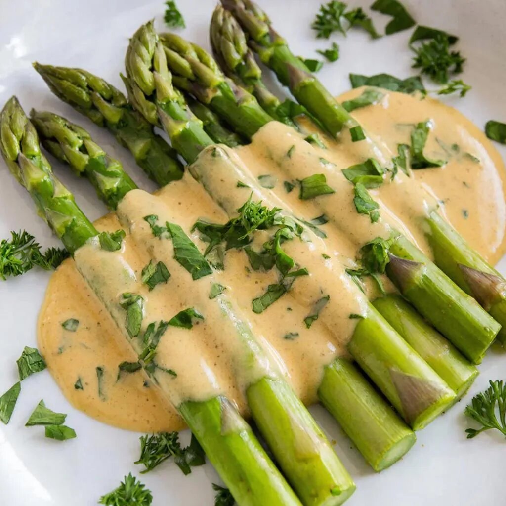 Выложить приготовленную спаржу на блюдо, полив её частью соуса. Украсить свежими травами и подать немедленно.