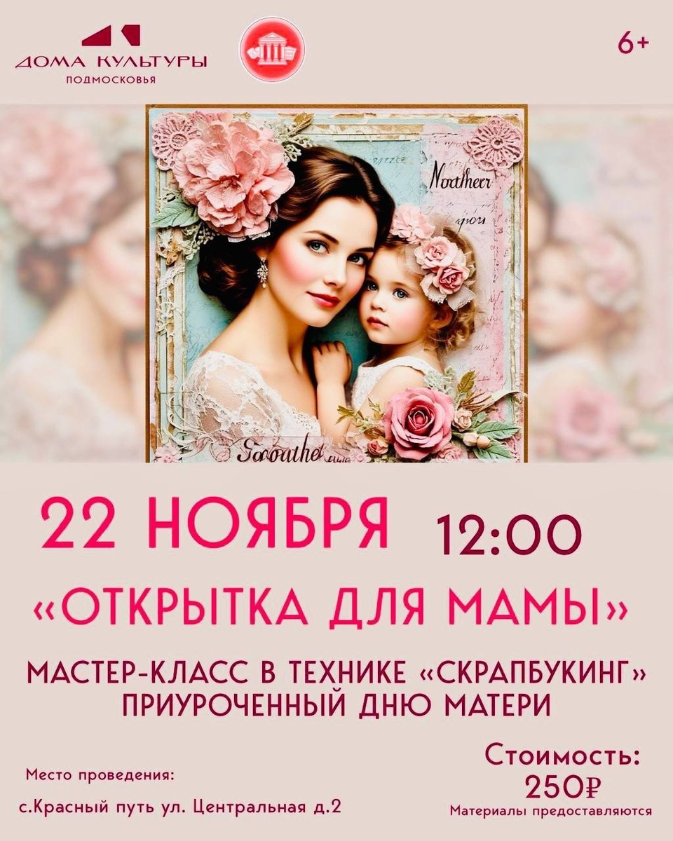 ✨ СДК «Русь» приглашает 🌸🌸🌸🌸🌸🌸🌸🌸🌸 «Открытка для мамы» - мастер класс в технике скрапбукинг, приуроченный Дню Матери, под руководством Галины Аносычевой 🌸🌸🌸🌸🌸🌸🌸🌸🌸 Порадуй маму и бабушку подарком, сделаным своими руками с любовью! 🚫 Возраст: 6+ 📆 22.11.2025🕒12:00 🏢 Сельский дом культуры (СДК) «Русь» 📍 г.о.Домодедово, с.Красный Путь, ул.Центральная, д.2 💰 Цена: 250 ₽ ✅ Мероприятия Домодедово https://dzen.ru/id/66f10385cc4c5a16f7b5fb02 http://vk.com/domodedovo_events http://dzen.ru/domodedovo_events