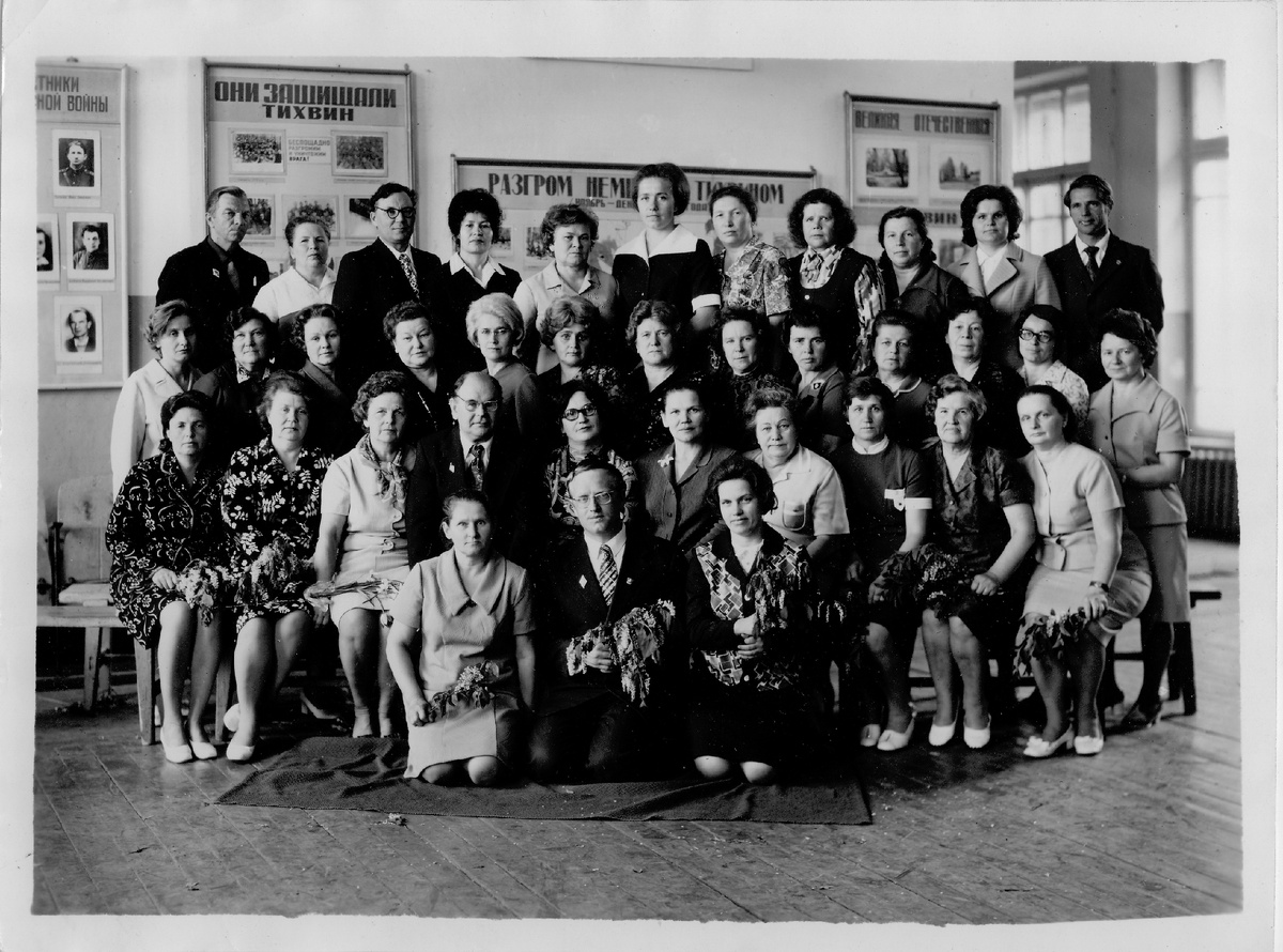 - 2 ряд: Белеутова Екатерина Андреевна (учительница начальных классов), Тетенёва Людмила Фёдоровна (география), Креслова Галина Ивановна (русский язык, литература),, Леонтьева Вера Павловна (завуч, история), Карпухина Галина Николаевна (английский язык), Данилова Галина Ивановна (учительница начальных классов), Черницкая Анна Степановна (учительница начальных классов), Шумилова София Александровна (русский язык, литература), Лучина Римма Александровна (химия), Коквина Нина Петровна (биология), Никольская Зоя Алексеевна (завуч, география), Скипидарникова Татьяна Александровна (старшая пионервожатая), Нарыкова Маргарита Ивановна (математика).