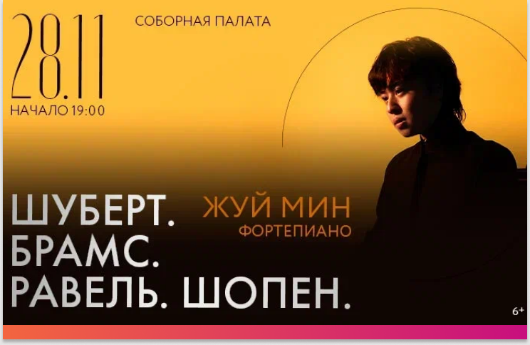 В 18 лет — 70 международных наград. Звучит как фантастика? Но это реальность юного пианиста Жуй Мина, который в свои 18 лет уже стал живой легендой музыкального мира. Победитель престижнейших конкурсов имени Рахманинова, обладатель Гран-при и золотых медалей, он покоряет самые строгие сердца по всей России. Его выступления на сценах Мариинского театра, Концертного зала Чайковского и «Зарядья» уже стали событиями. Теперь его искусство можно услышать в камерной акустике Соборной палаты. В одном вечере — целая вселенная фортепианной музыки. От пронзительного лиризма Шуберта и мощной страсти Брамса до утонченных звуковых полотен Равеля и поэтических откровений Шопена. В руках Жуй Мина каждый композитор зазвучит по-новому — ярко, глубоко и по-юному смело. 28 ноября — ваш шанс услышать не просто многообещающего пианиста, а состоявшегося артиста, чья игра поражает зрелостью и техническим совершенством. Уникальная возможность стать свидетелем зарождения великой карьеры в уютной атмосфере истор