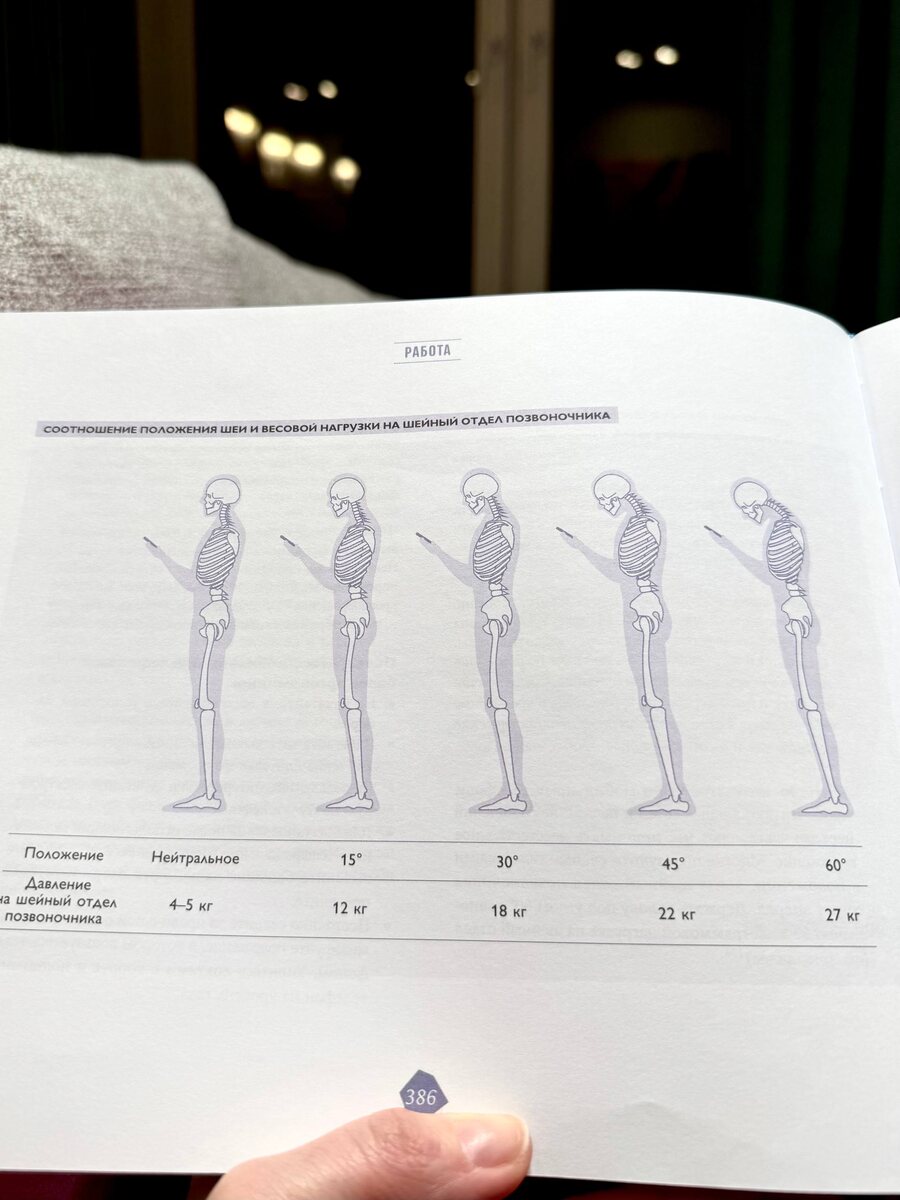 А как вы смотрите в телефон? Вспоминаю термин из 2010-х — техношея 🤳📱📵 Бежала тут на встречу и (как обычно) по пути отвечала на сообщения. И вдруг вспромнила, как в выходные штудировала книжку про биохакинг и обнаружила в ней вот эту иллюстрацию. Как меняется давление на шейный отдел позвоночника в зависимости от угла наклона шеи к телефону. Нейтральное положение — нагрузка 4-5 кг 15 градусов — 12 кг 30 градусов — 18 кг 45 градусов — 22 кг 60 градусов — 27 кг Я срочно выпрямилась и вам рекомендую сделать тоже самое прямо сейчас. А лучше по пути не отвечать. Кому знакомо? Вспоминаю любимый хештег #яусебяодна