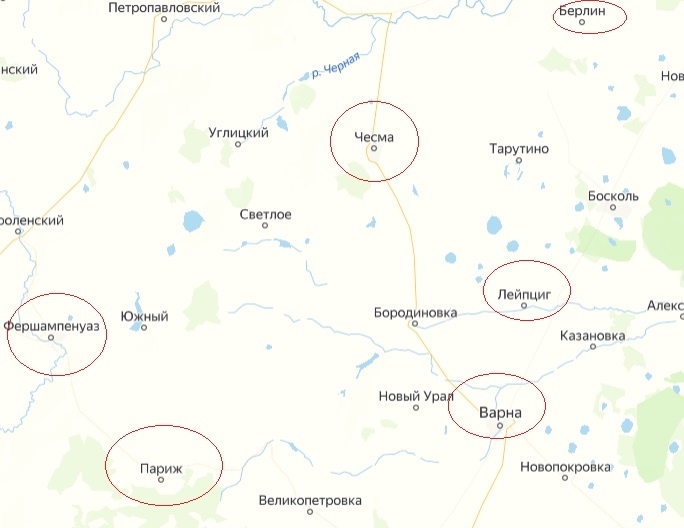 сел с не менее интересной историей и названиями. Например, село Варна. Оно было основано в то же время и получило название в честь взятия русскими войсками болгарской крепости Варна во время русско-турецкой войны 1828-1829 годов. Есть в Челябинской области и свой Париж, названный в честь взятия Парижа русской армией в 1813 году. (Кстати, в российском Париже имеется и своя Эйфелева башня, правда, в 6 раз меньше настоящей). Помимо этого, в Челябинской области можно побывать еще в селах с названиями Чесма, Порт-Артур, Берлин, Фершампенуаз и т.п. Все они были