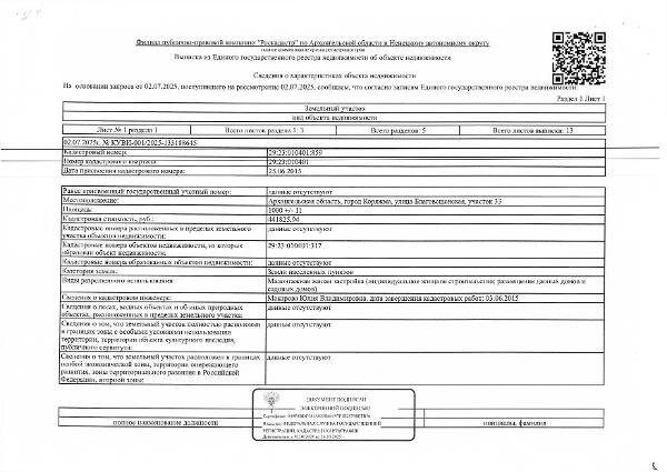 Название: 1/5 доля в праве общей долевой собственности на земельный участок общей площадью 1000 кв. м, кадастровый номер: 29:23:010401:859, категория земель - земли населенных пунктов, вид разрешенного использования - малоэтажная жилая застройка, адрес: Архангельская обл., г. Коряжма, ул. Благовещенская, участок 33 1 Штука (шт) Канал: Госземля Архангельская область Область: обл Архангельская Архангельская обл. Район: г. Коряжма Населенный пункт: ул. Благовещенская, участок 33 Локация: Смотреть на карте ВРИ: Жилая застройка Кадастровый номер: 29:23:010401:859 Кадастровая стоимость: - Вид сделки: Продажа Площадь: 1000 м² Начальная цена: 48535.00 руб. Дата завершения: 18.12.2025 Подробнее: ГИС ТОРГИ #госземля #земляотгосударства #земля #земельныйучасток #земельныеторги #торги #аукцион #продажаземли #продажа #архангельскаяобласть
