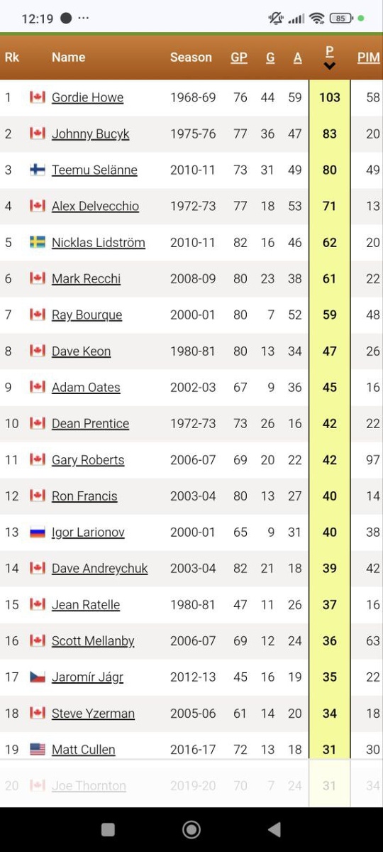 Вспоминаю свою прошлогоднюю рубрику. И смотрю, где находится Овечкин в таблице достижений по своему возрасту. Ему 40 - поэтому и таблица про 40-летних. Пока Ови идёт на 37-м месте, и, конечно, поднимется выше - три четверти сезона впереди. Но до самой вершины ему, конечно, не добраться. Горди Хоу в ветеранском возрасте набирал очков даже больше, чем в молодые годы!